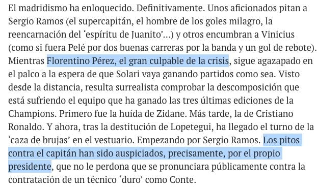 Ha tenido que venir un columnista de 'Sport' a contarnos que Florentino es "el gran culpable" de la crisis del Real Madrid y que los pitos a Sergio Ramos han sido auspiciados por el propio mandatario merengue. En el empleo de esta curiosa teoría se une a otros varios gacetilleros de la prensa madrileña y pseudomadridista, además de al mismísimo Manolo Lama, muy a pesar de que Manuel Matamoros, uno de los responsables de la Grada de Animación del club, lo ha negado por activa y por pasiva. Pero les da igual. Menos mal que tenemos a Mascaró, Lama y otras lumbreras para descubrir lo que sucede realmente en el Santiago Bernabéu.