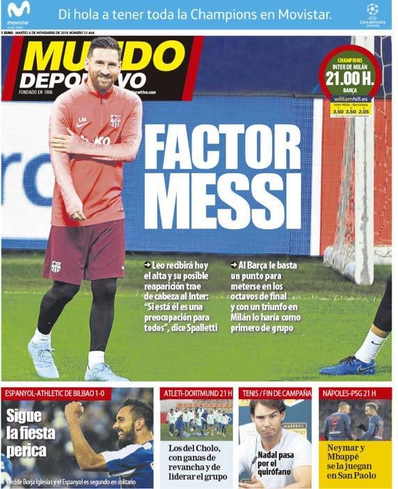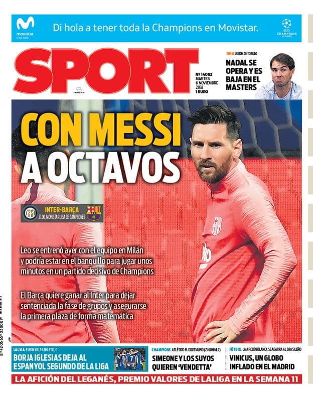 "Con Messi a octavos", anuncia casi a bombo y platillo el diario cataculé. Si el Barça cae en Milán, la celebración tendrá que esperar, aunque no conciben esa posibilidad en la redacción. Vuelve Leo y con él la felicidad, el banquillo para Rafinha tarde o temprano, la ilusión, el fútbol, la eternidad. Al menos hasta cuartos de final, donde el cielo está muy cerca del suelo.