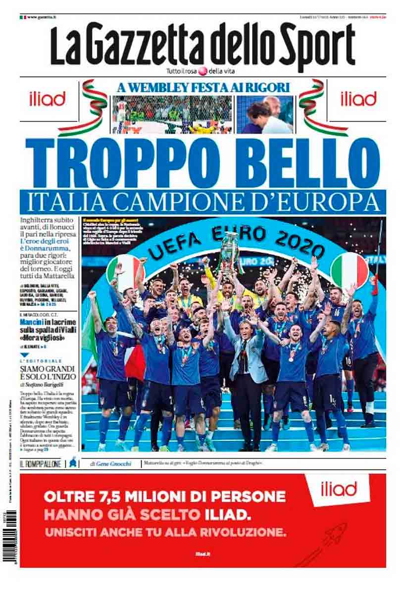 La cosa se resolvió en los penales, como bien indican las portadas de As y Marca, donde brilló Donnarumma (qué bellezza de apellido, Dios bendito) y también brilló, pero por su ausencia, el sentido común y la templanza de Southgate. Metió a dos de sus mejores jugadores jóvenes exclusivamente para lanzar los penaltis de la tanda, y ambos fallaron. No se recuerda cagada mayor de un técnico en una tanda de penas máximas. Bueno, perdón, sí se recuerda. Está lo de Simeone, que en virtud de no sabemos qué supersticiones llevó a su equipo a lanzar los penaltis en el fondo madridista y tirando segundo en la tanda de San Siro, en 2016. Hubo similitudes entre esta tanda y aquella. Rashford al pal y los buenos ganando. Decimos que ganaron los buenos porque Inglaterra se había colado en esta final merced a un penalti denunciable ante la justicia ordinaria, fruto de la gratitud de Ceferin ante el modo expeditivo en que Boris Johnson sacó de la Superliga (aunque, como sabemos, nadie se ha ido de ella) a los clubes ingleses. Las preferencias se inclinan inevitablemente por el menos favorecido por el establishment, de manera que ayer íbamos con Italia, sí. Con la Italia vencedora de Guardiola frente a la Inglaterra que solo habría sido de Guardiola si hubiera vencido.