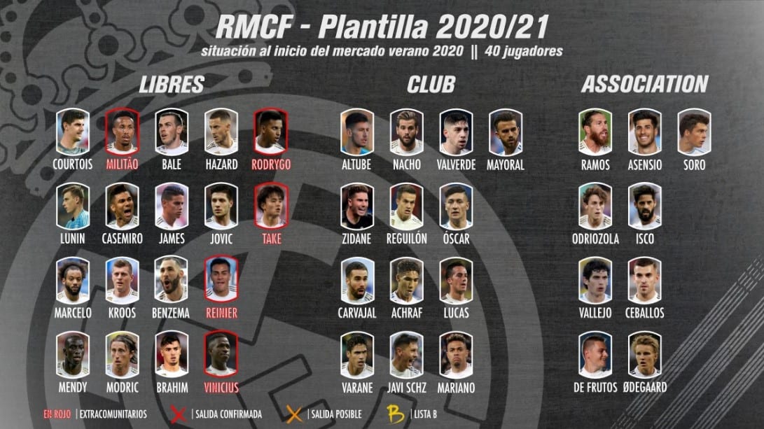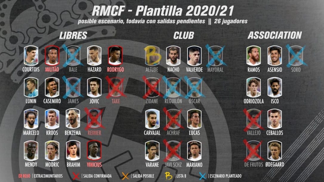 Courtois, Lunin, Altube, Carvajal, Odriozola, Ramos, Varane, Militao, FICHAJE, Mendy, Reguilon, Casemiro, Valverde, Oscar, Odegaard, Ceballos, Kroos, Asensio, Rodrygo, Hazard, Vinicius, Benzema, Jovic. 23 jugadores. Me sobran Isco, Marcelo, Modric, Mariano, Vazquez, Brahim, Bale, James y Nacho. Como el Madrid parece que es incapaz de colocar jugadores con los que no cuenta pues venderá a Oscar, dejaran cedido a Ceballos, no ficharan a nadie y nos comeremos a Bale, Vazquez, Modric, Nacho y compañía otro año más. Luego nos extrañaremos que no pasemos de octavos en Champions. Menos mal que el Barcelona esta como esta... y la liga ayuda a verlo todo más relajado, pero la confección de la plantilla es un verdadero desastre.