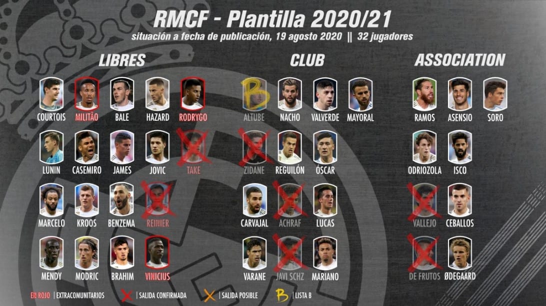 Serían en total siete salidas confirmadas, más Altube (lista B). Aunque antes hemos comentado que Vinicius sería elegible para la lista B, consideramos que el club optará por inscribirle en la A. Así que hoy 19 de agosto, a menos de un mes de que dé comienzo LaLiga 2020/21, el Madrid contaría todavía con 32 jugadores; 7 salidas pendientes para poder cerrar una lista de 25.