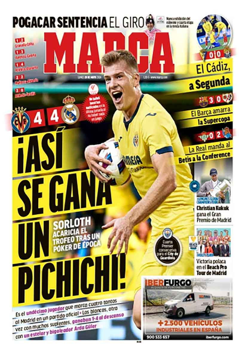 En Mundo Deportivo, abajo, dice que Sorloth marcó 4 goles en el Bernabéu.