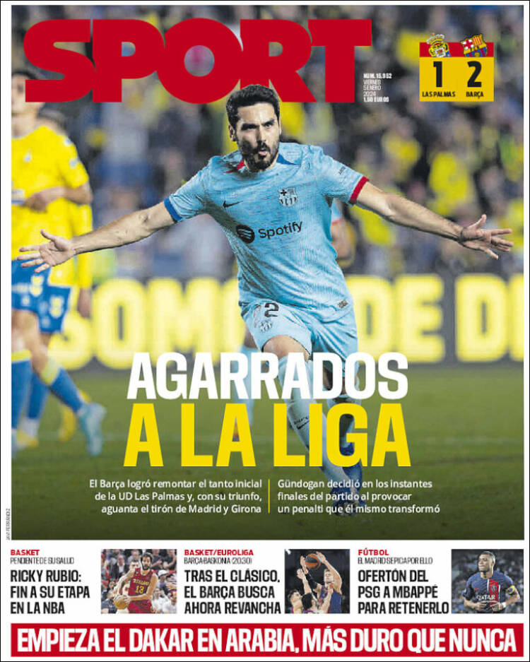 Por cierto, Sport refleja hoy la victoria culé ante Las Palmas, victoria arrancada pese a -una vez más- un pésimo juego y merced a un penalti más que discutible en los últimos estertores del partido. De esto, es decir, de lo discutibilísimo del penalti, no dice nada la portada de Sport, y tampoco la de su competidor Mundo Deportivo. Debe de ser porque la costumbre convierte las cosas en poco noticiables. Todas, absolutamente todas las jugadas dudosas caen del lado blaugrana, y lo hacen con la misma falta de naturalidad con la que Gundogan hizo el salto de la rana al notar el mínimo contacto del defensa de los canarios sobre sus navegadas espaldas.