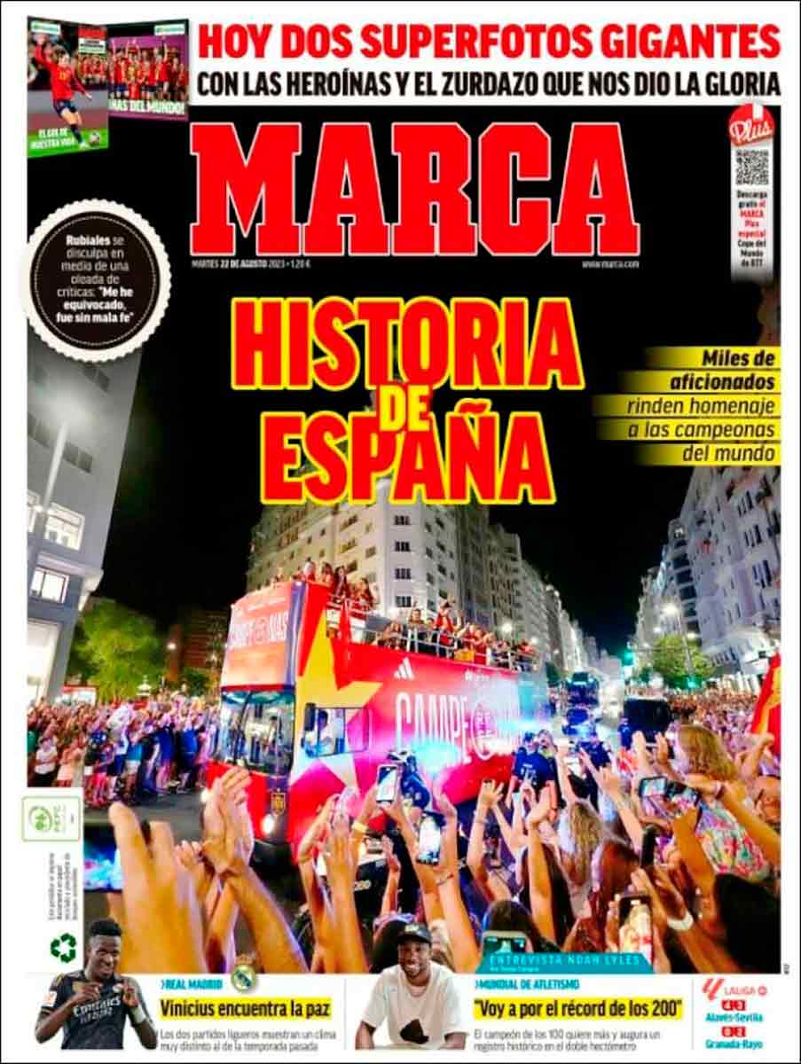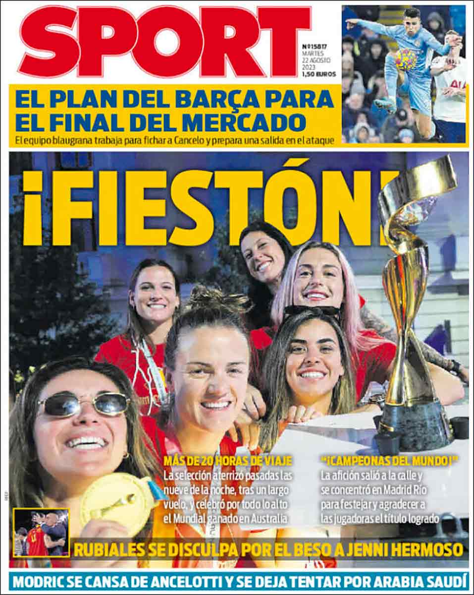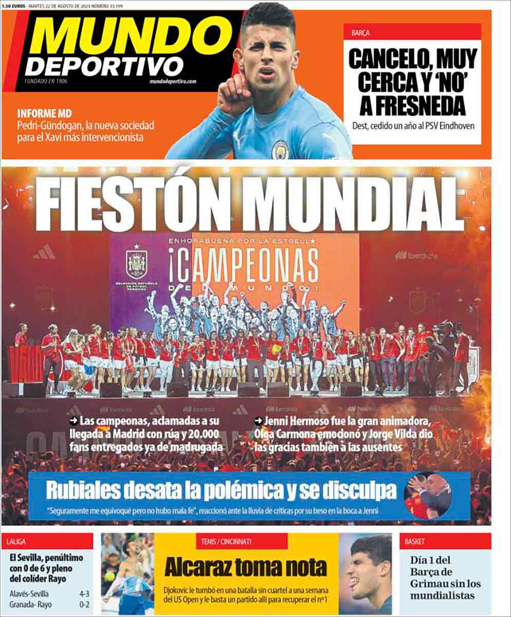 Las portadas, todas, al igual que ayer y con todo merecimiento —un mundial no se gana todas las semanas— dedican la mayor parte de ellas mismas a esta fiesta de España por el Mundial de fútbol ganado.
