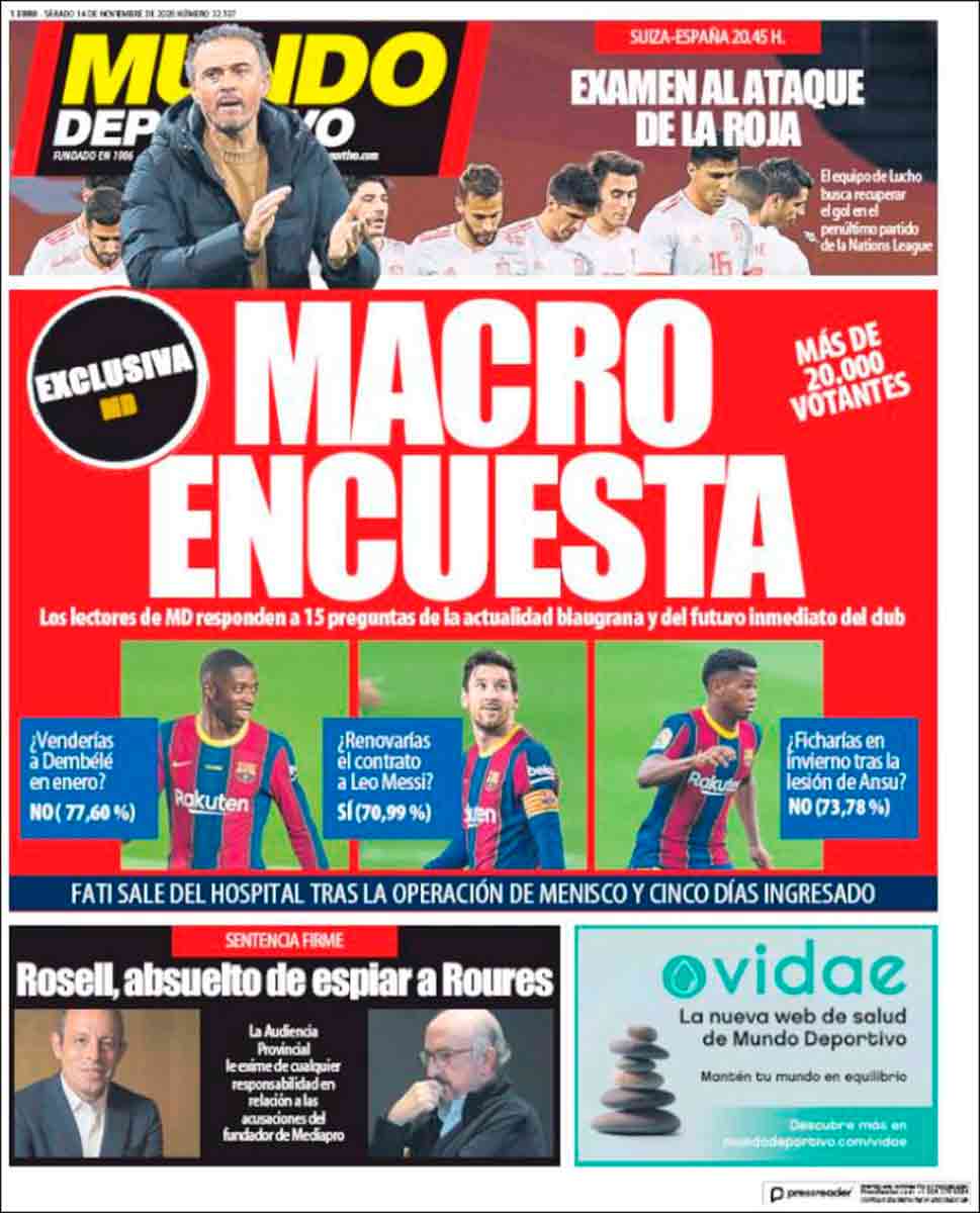 Y de la comedia a la parodia (otras veces es al revés, pero se produce invariablemente la alternancia) de Mundo Deportivo, donde nos anuncian una MACRO ENCUESTA con “más de 20.000 votantes” al estilo de “enriquecido con hierro y vitamina b12”. Quince preguntas han hecho, dicen (quin-ce, a-ños, tiene mi amo-o-o-orr… es la tonadilla que nos viene en semejante ambiente festivo), sobre la actualidad del Barsa, aunque destacan tres de las que nosotros vamos a mencionar dos: “Venderías a Dembélé en enero?, a lo que el 77,60 % dice NO (risas enlatadas); y “¿Renovarías el contrato a Leo Messi?”, a lo que el 70,99 % dice SÍ (Benny Hill persigue al pobre abuelete calvo). Y todo esto mientras Rosell ("da igual cuando leas esto", cabría decir ya) sale absuelto.
