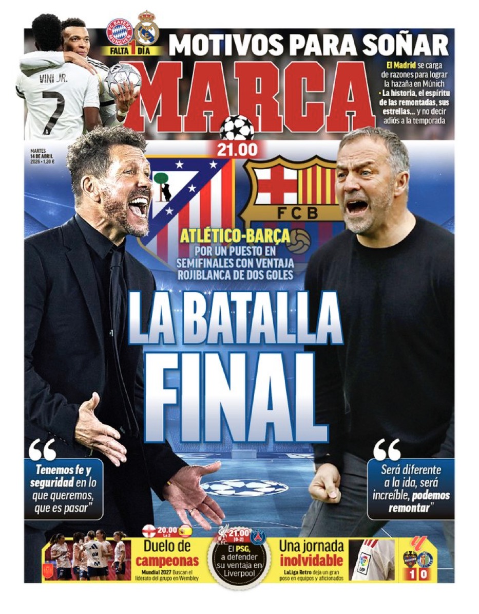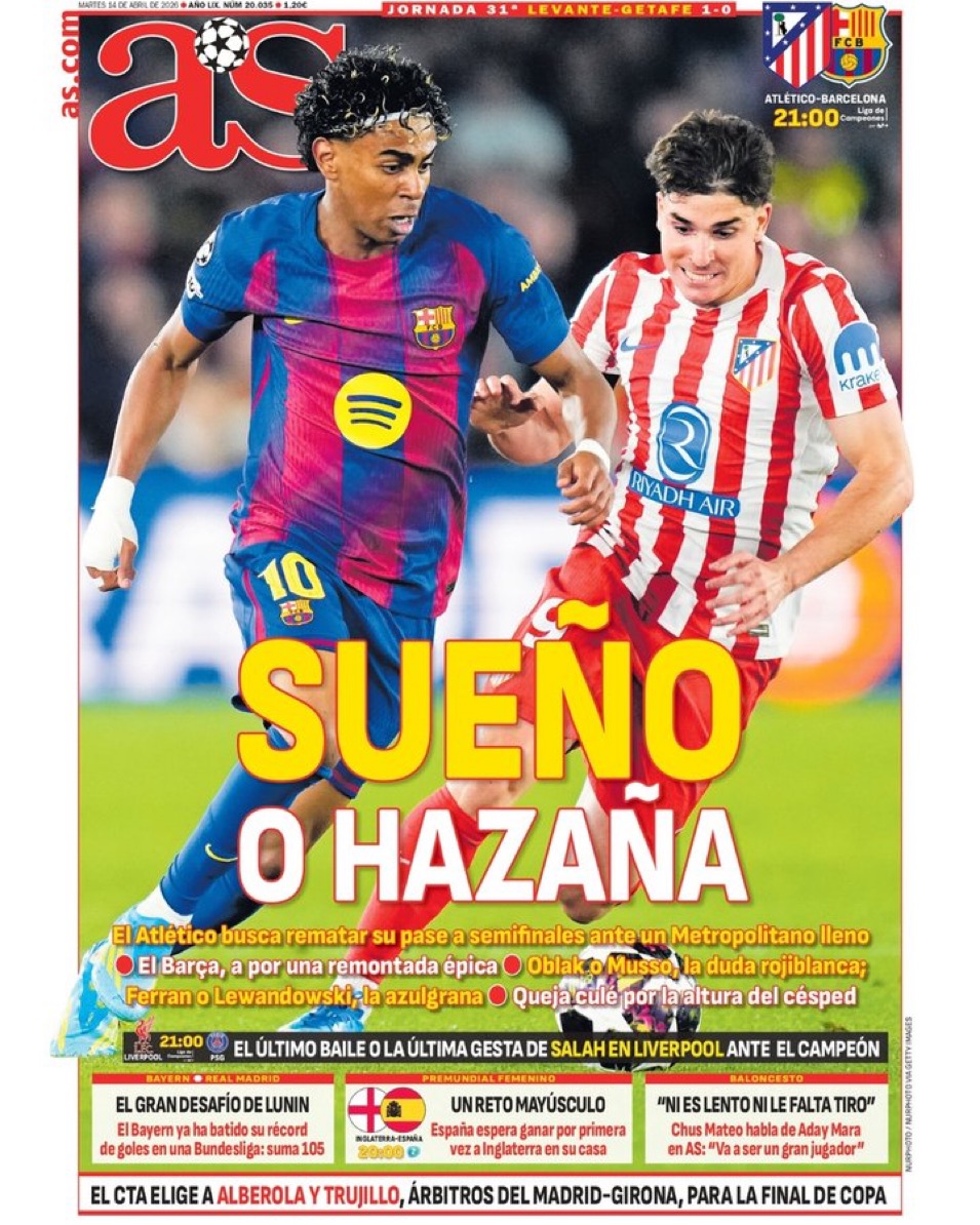 En todo caso, y a la espera de la gran cita del Madrid mañana en Múnich, hoy abren cita Atleti y club cliente de Negreira en la competición continental. Os recordamos la frase de Iñako Díaz-Guerra, articulista cuya adscripción colchonera no le impidió amasar una cita ya célebre: “Al Atleti no se le puede dar nunca por vivo”. Por elemental respeto a esa máxima eterna, concluiremos que las espadas están en todo lo alto pese al 0-2 de la ida, y que las quejas culés por el estado del césped del Metropolitano, previas al partido, nos permiten delimitar, como decía un tuitero, a qué santos se abonan las aficiones para sus intentos de remontada: la madridista, a Juanito; la culé, a Xavi Hernández.
