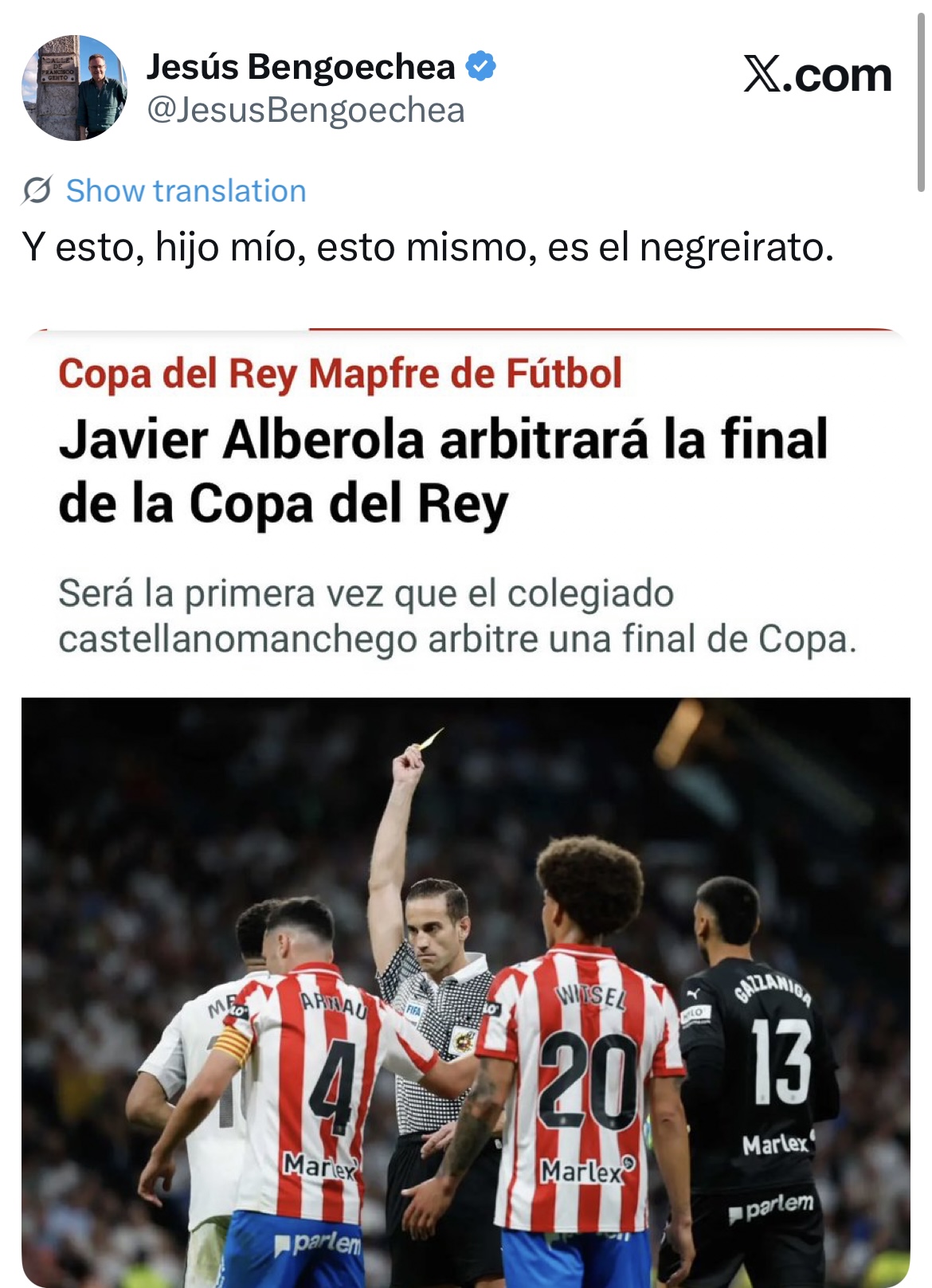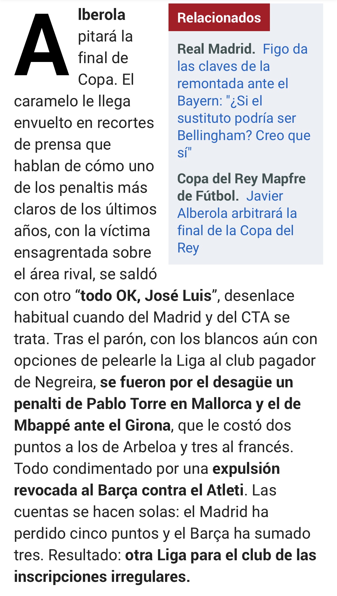Por cierto, a estas horas ya sabréis sobradamente quién es el árbitro designado por el corrupto sistema para pitar la final de Copa. Vuelve a quedar demostrado que quien se equivoca perjudicando al Real Madrid, o beneficiando al equipo del régimen, no solo no tiene castigo sino que tiene premio. Esta designación habla libros del lóbrego funcionamiento del engranaje de corrupción más siniestro y prolongado jamás concebido.