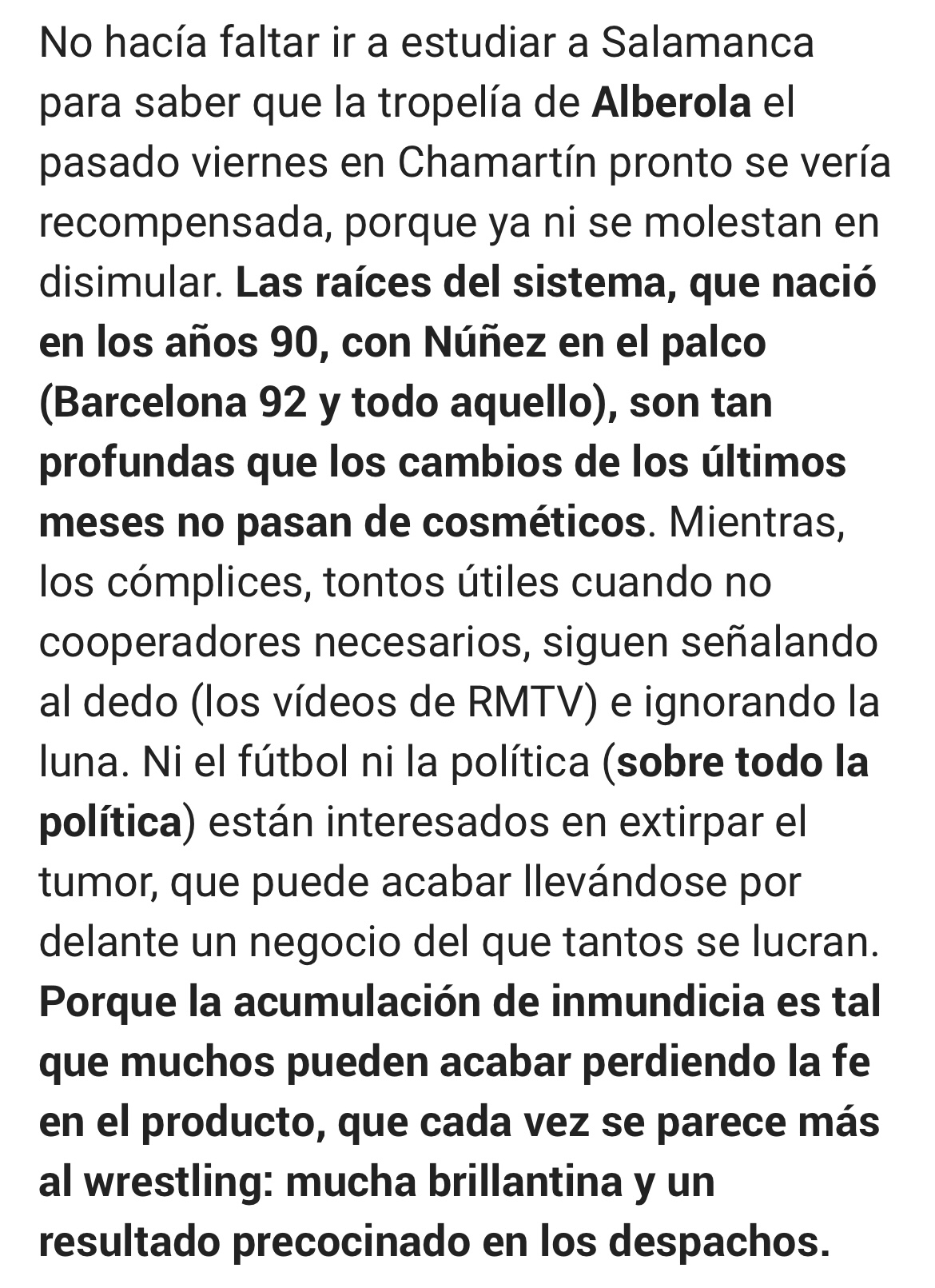 Pocas veces ha escrito nadie con tan libérrima valentía en un medio deportivo de gran lectorado. Nos satisface especialmente, por ejemplo, el que alguien se lance al fin, ante una audiencia masiva, a datar el origen de la putrefacción reinante al momento en que le fue asignada a Barcelona la celebración de los Juegos Olímpicos de 1992. Esto es intuición, la tiene Siguero y la tiene cualquiera: en ese momento histórico, alguien decidió que el equipo de fútbol de aquella ciudad debía también ganar las ligas de fútbol del país, y así sucede casi siempre desde entonces, con periodos (como el 2001-2018) en los que ese favoritismo quedó plasmado a través de las facturas de Negreira.