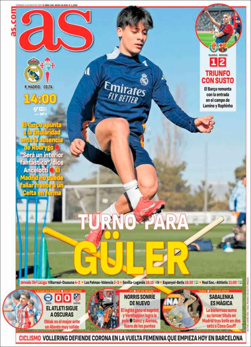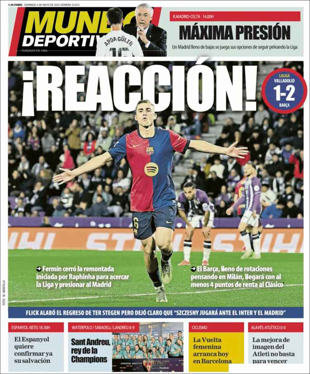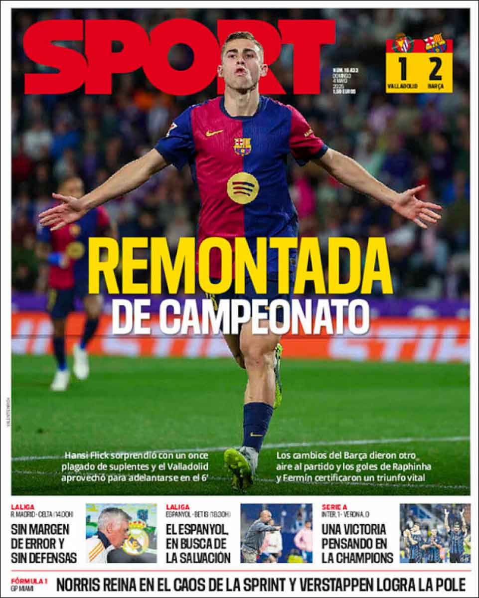 Buenos días, amigos. Ayer jugó en Valladolid el equipo con nombres mil: el club cliente de Negreira, el palancas, el de los inscritos, el más que un club, el Barça, el FC Barcelona. Presentó una alineación con rotaciones pensando en el partido de vuelta de Champions contra el Inter. Y se marchó al descanso perdiendo por un gol a cero. Daba igual, todo el mundo sabía que no iba a perder en Pucela, que todo se quedaría en un susto, como refleja la portada de As.