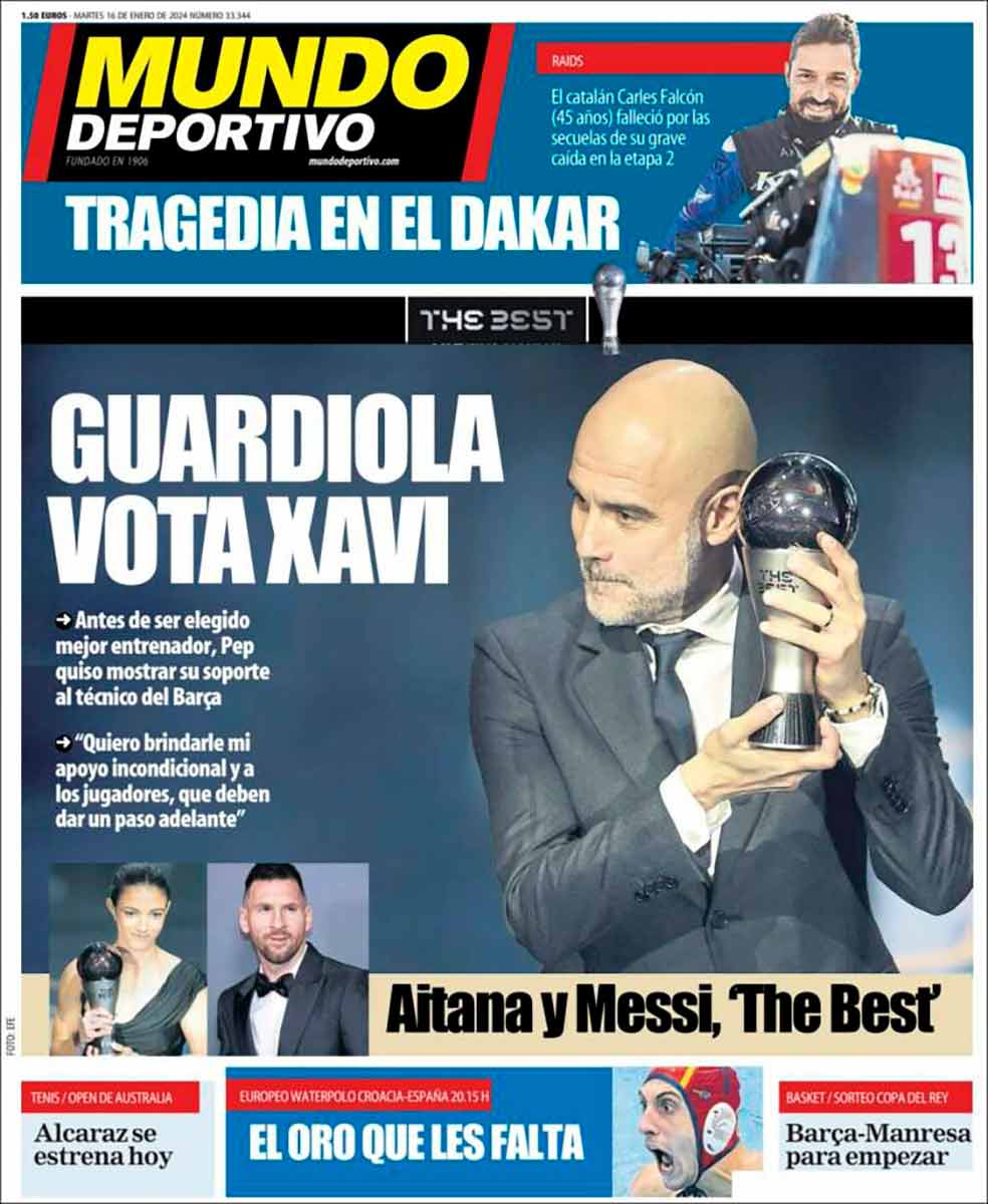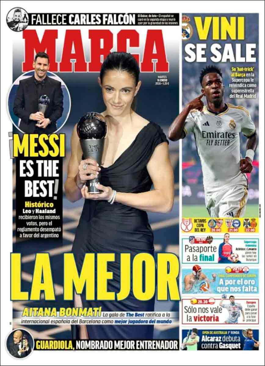 La imagen principal sin embargo es para Aitana Bonmatí, no esperábamos menos. «La mejor» titula Marca. Debajo, destacan que Guardiola, en la misma gala, ha sido nombrado mejor entrenador. Central lechera pura y dura, como podéis comprobar.