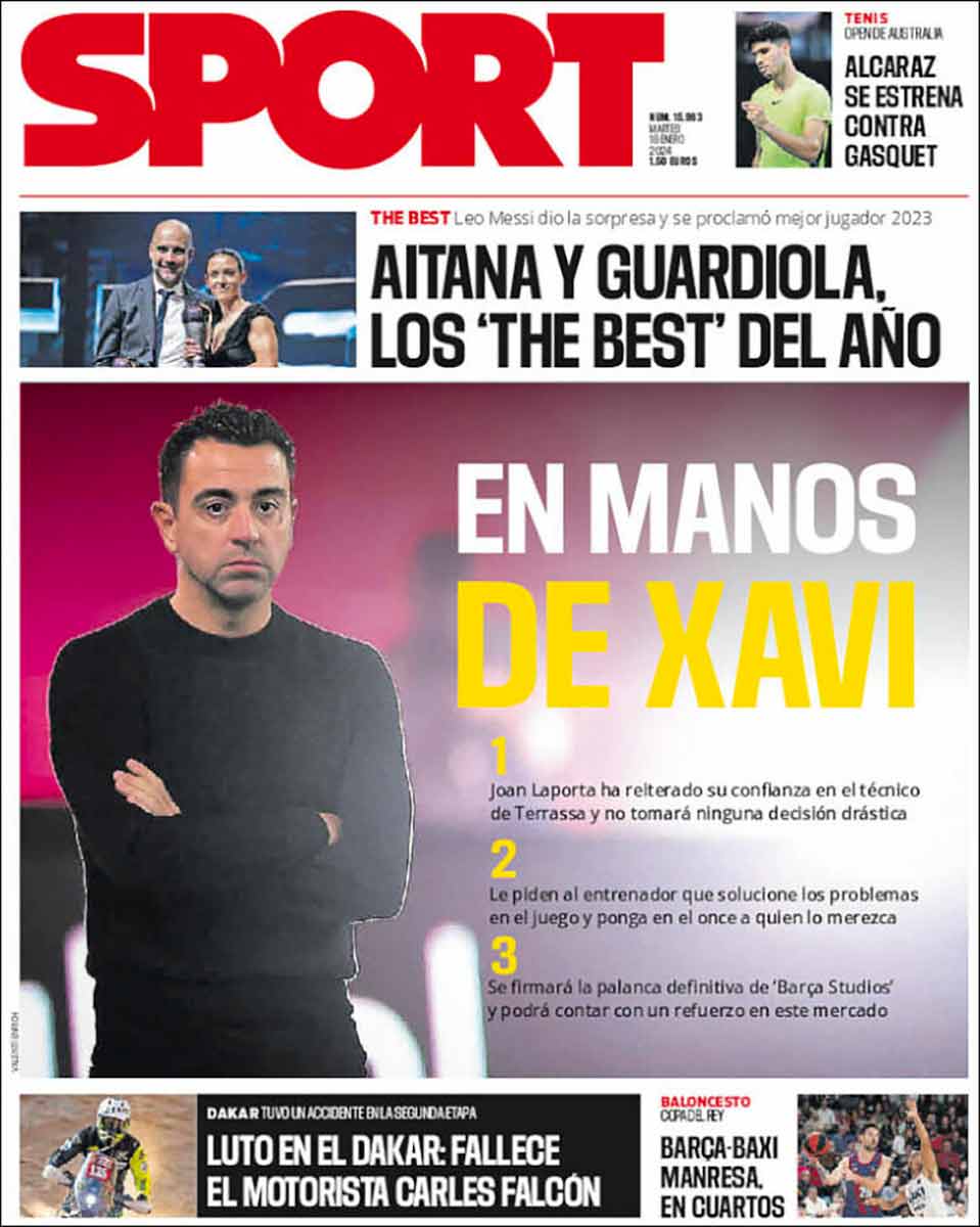 Sport dedica su portada a un exultante Xavi Hernández, cuarto mejor entrenador del mundo, recordad, y recuerdan que están en sus manos. Destacan tres puntos: la confianza de Laporta en él; le piden que solucione los problemas del juego y que ponga a quien merezca jugar; y, por último, afirman que se firmará la palanca definitiva de Barça Studios y podrá contar con un refuerzo en este mercado de invierno. Es decir, van a volver a perpetrar otra estafa consentida por Tebas. Y además dejan constancia de ello por escrito.