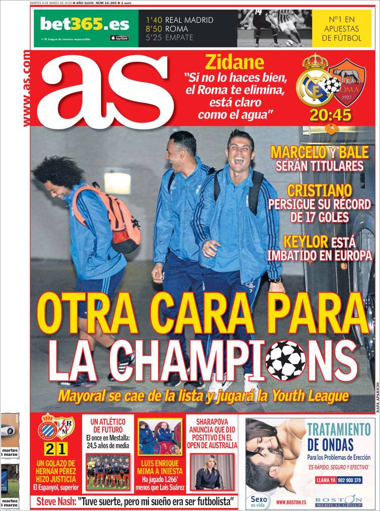 Casi hasta se le escapa, sí, aunque al final hayan optado por traer a portada una escena desenfadada entre Marcelo, Keylor y Cristiano, nunca se sabe con qué intención pero qué más nos da en un día como hoy su intención. Hoy estamos con el niño que fuimos y el cual, por el bien de su propio desarrollo emocional o intelectual, nunca leyó As, o no al menos el As actual. Hoy es día de Champions y por tanto somos ese niño que no va a prestar atención alguna a las cosas del editorial del Relaño de hoy, ese Relaño al que hoy leemos ya con la perplejidad con que el Principito de Saint-Exupery escuchaba hacer cuentas al hombre de negocios de aquel asteroide. Tenemos esta noche muchos elefantes que pintar dentro de muchas boas constrictor, Alfredo. Déjanos en paz.