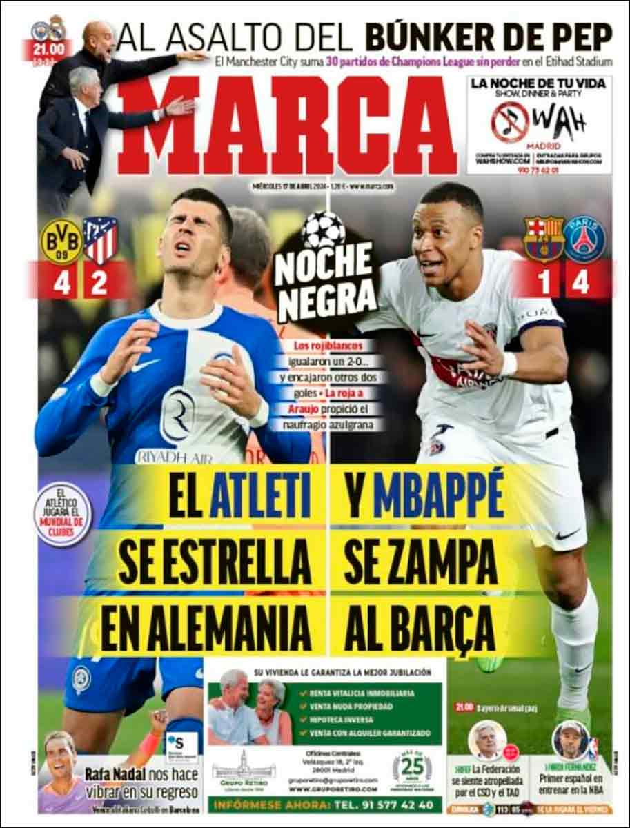 Dice Marca que el Atleti se estrella en Alemania y que Mbappé se zampa al Barça en una portada divida por mitades para ambos partidos. La imagen elegida para ilustrar la derrota del Atleti —«Nunca dejes de caer», gracias, Mario de las Heras— es la de Morata. No se nos ocurre ningún jugador, Morata, que represente tan bien a un club, el Atleti, y ningún club, el Atleti, tan a la medida de un jugador, Morata. Pero dejémonos de frases rajoyanas.