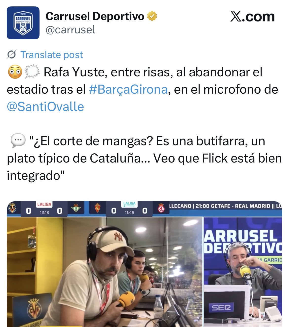 En fin. Parece que Hansi Flick tiene un fair play de quita y pon. El hecho como decimos es que, lejos de estar consternado y pedir disculpas, el entorno culé se toma a rechifla los dos cortes de manga, cuando no se manifiesta a favor de los mismos. Eso sucede porque son unos horteras de manual. La prensa local, como habéis visto, adopta un tono de indisimulado orgullo ante la hazaña, y el directivo Rafael Yuste muestra desacomplejadamente su regocijo.