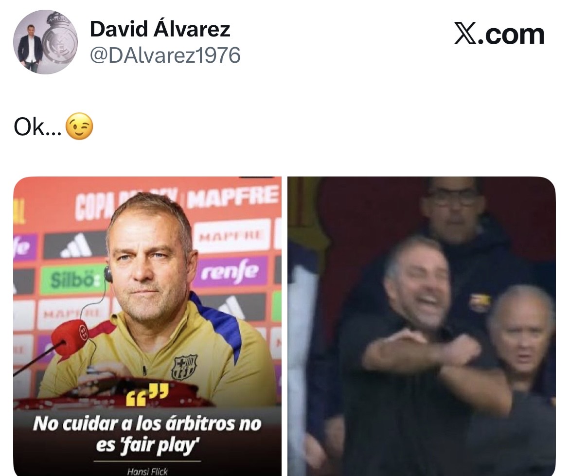 Las dos butifarras de Hansi Flick, ejecutadas desde el banquillo donde no debería haber estado, no dejan de marcar un curioso contraste entre lo que el protagonista de las mismas piensa y lo que por otro lado hace. ¿Recordáis cuando criticó los videos de RMTV porque “eso no es fair play y hay que respetar al árbitro”? Ajá. ¿Dónde queda dicho respeto en las butifarras?