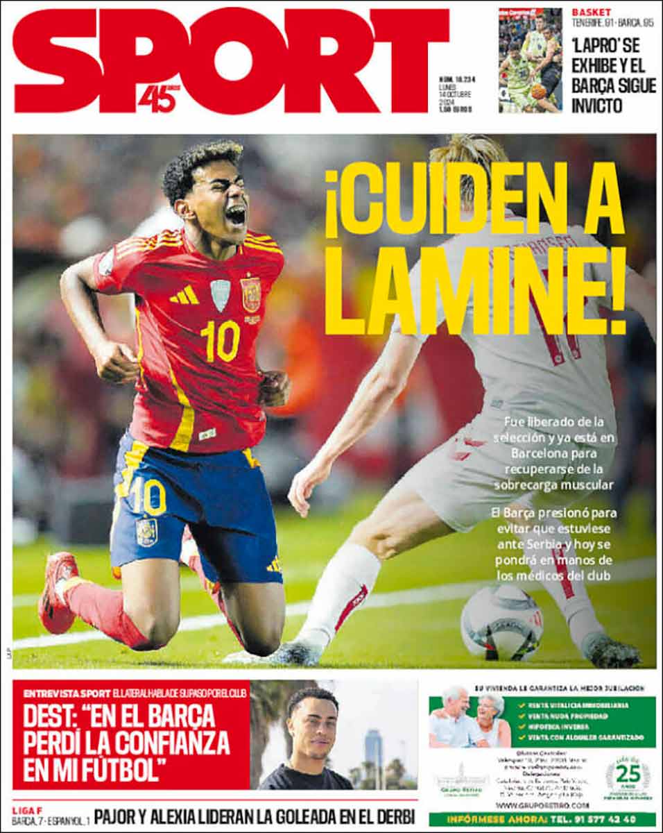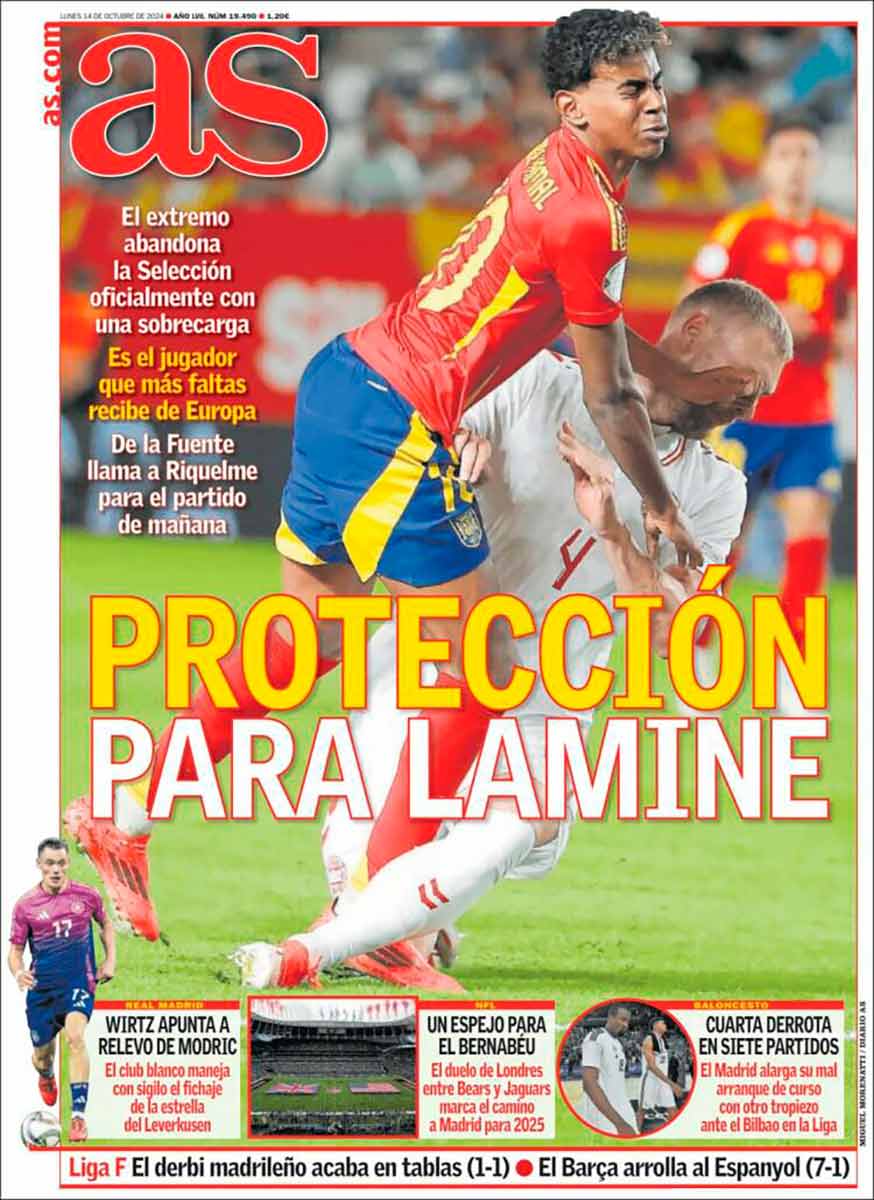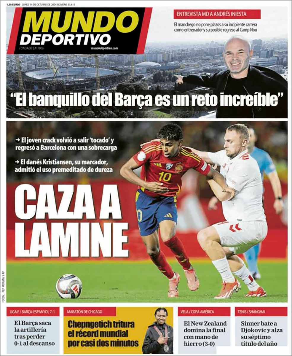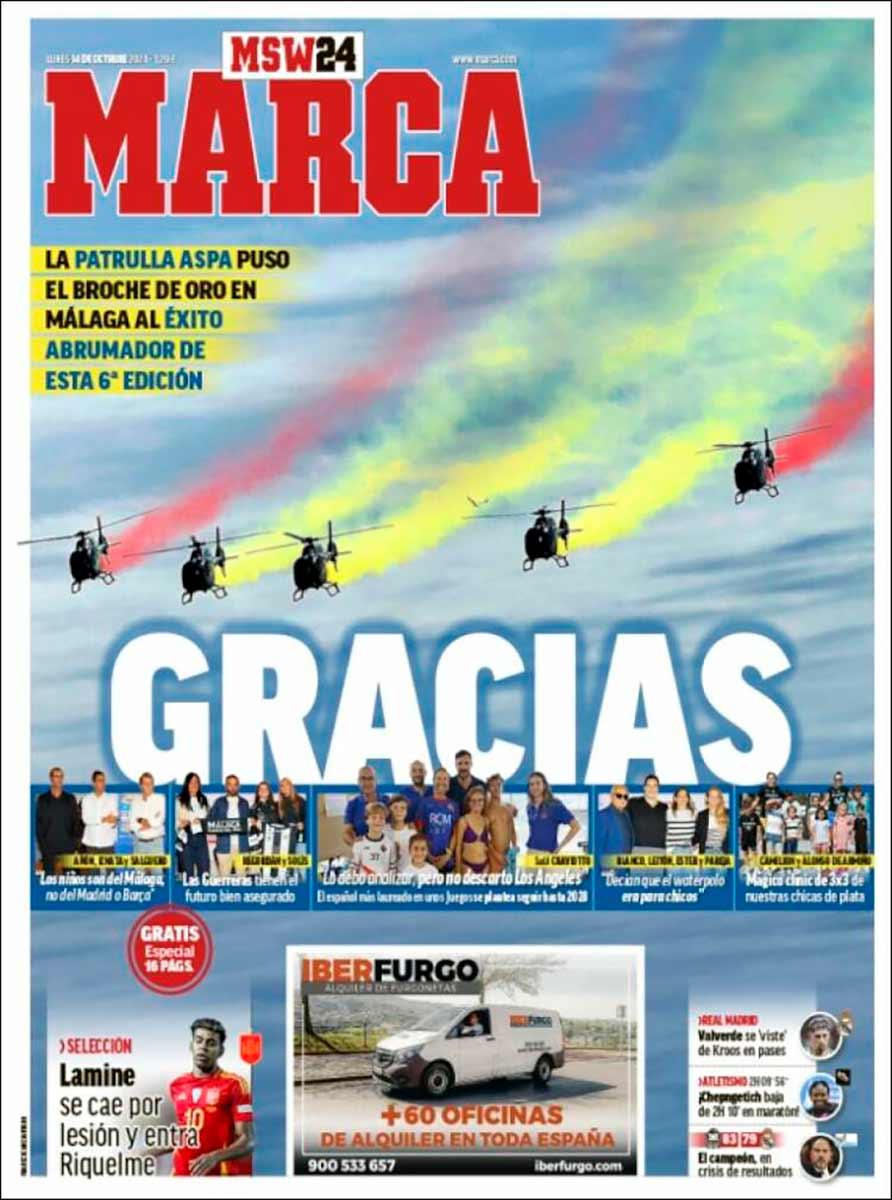 La prensa deportiva de la jornada sí que comienza el día haciendo sus deberes, es decir, cuidando a Lamine. No se vaya a decir luego, precisamente dos días después de la celebración del Día de la Hispanidad, que no tenemos una prensa debidamente celosa del bienestar de la gran estrella de nuestra selección. El 75% de las portadas en esta gris mañana de octubre reclaman, entre coléricas y consternadas, que no se le peguen más patadas al joven delantero, y si no llegamos al 100% es solo porque Marca organizó un sarao en Málaga y prefiere hoy recurrir a la contorsionista y bella disciplina de la autofelación. Mal Marca aquí. ¿Acaso no saben que Lamine Yamal constituye un estandarte nacional de jerarquía superior a la Patrulla Aspa? (Por cierto, ¿qué demonios pinta un grupo acrobático del Ejército del Aire en un evento privado de Unidad Editorial?).