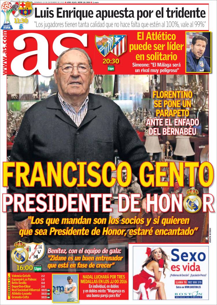 En su editorial de hoy, Relaño elogia la figura de Gento -lo contrario ya sería causa de delirio severo o de irreversible irresponsabilidad- a la vez que critica la propuesta anunciada ayer por Florentino, al considerarla un mero pretexto para aplacar los ánimos de la afición madridista que esta tarde visite el Santiago Bernabéu; todo ello, claro está, según el casi nunca alentador pronóstico del periodista. Ocurre que este difícil equilibrio que ensaya Relaño en su texto firmado no llega ni a atisbarse en la portada que esta mañana nos insulta a la cara. En ella no hay ni el más mínimo asomo de elogio a la figura del mítico extremo cántabro, sino justamente todo lo contrario. Según la portada del diario As -apunten la fecha porque ya decíamos que hasta aquí hemos llegado; una vez más, y ya son demasiadas las veces que hemos llegado hasta aquí de la mano del diario de PRISA- Paco Gento no es todo aquello tan glorioso que decíamos en párrafos anteriores y que el mismo Relaño apunta en su homilía, sino un simple parapeto de Florentino, una mera estratagema, un dique de contención, un simple medio y no un fin en sí mismo.