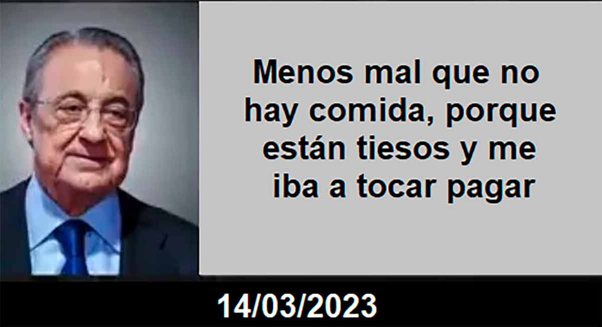 Es una maravilla todo, amics. Parece que Laporta se ha enfadado con Florentino a resultas del anuncio blanco según el cual se van a personar como parte perjudicada en el BarçaGate. Seguro que a Jan le parecía que Florentino debía aceptar sin pestañear que le hayan tangado al Madrid, a la cara, Ligas durante veinte ¿treinta? años. Así que, muy enfurruñado, se dice que Laporta cancelará la comida de directivas previa al mal llamado clásico de la semana que viene. El ingenio anónimo de los memes, de nuevo, ha hecho de las suyas.