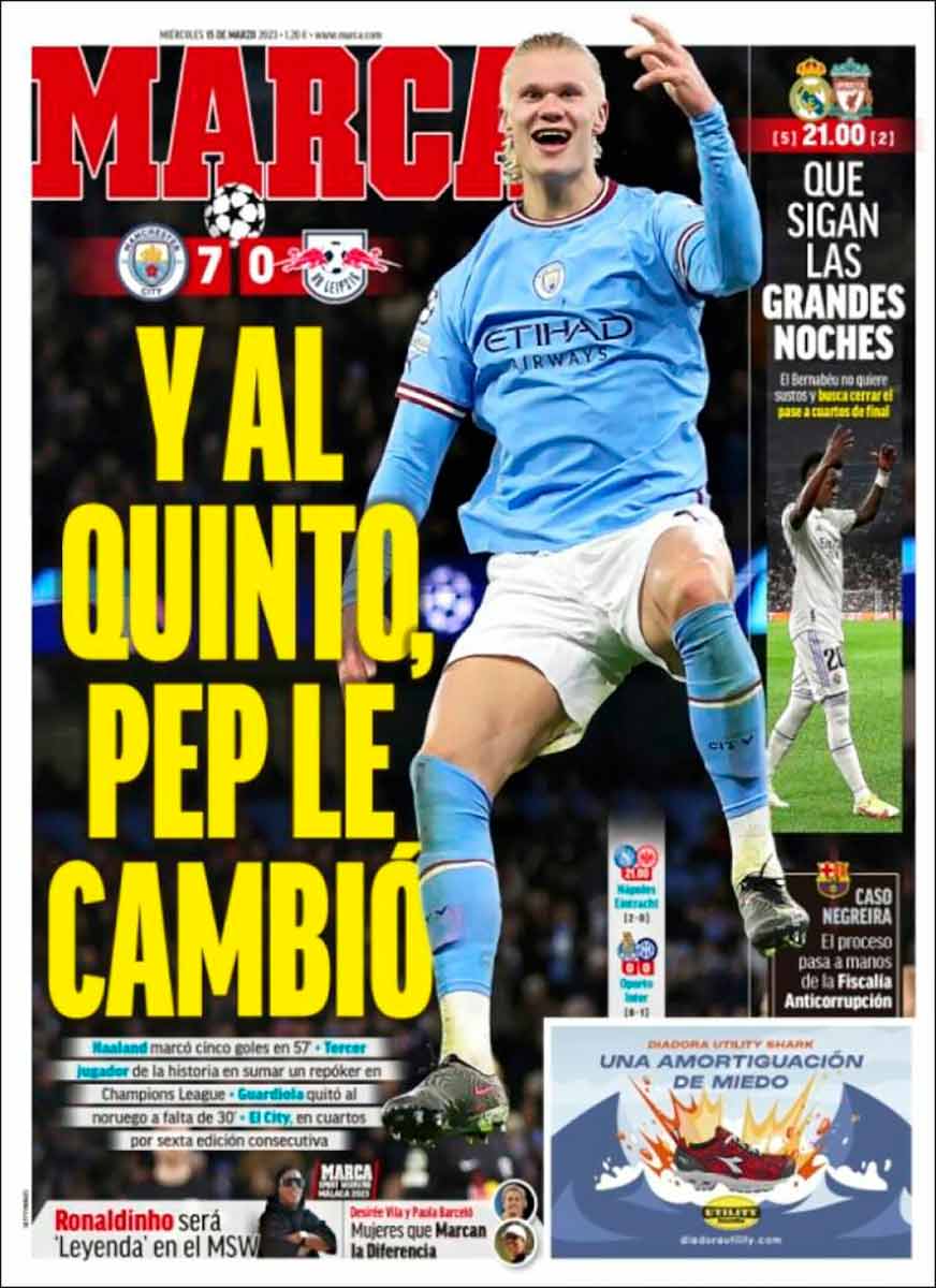 Por lo demás, Haaland le metió ayer cinco goles al Leipzig, él solito, y Pep le sentó inmediatamente no fuera a ser que batiera el récord de goles en un partido de Champions que ostenta Messi. Así lo admitió, básicamente, en entrevista posterior al partido del City. Para chulo Pep, a quien por cierto nadie ha preguntado todavía, que sepamos, por Negreira. Qué raro, con las cosas que podría contar.