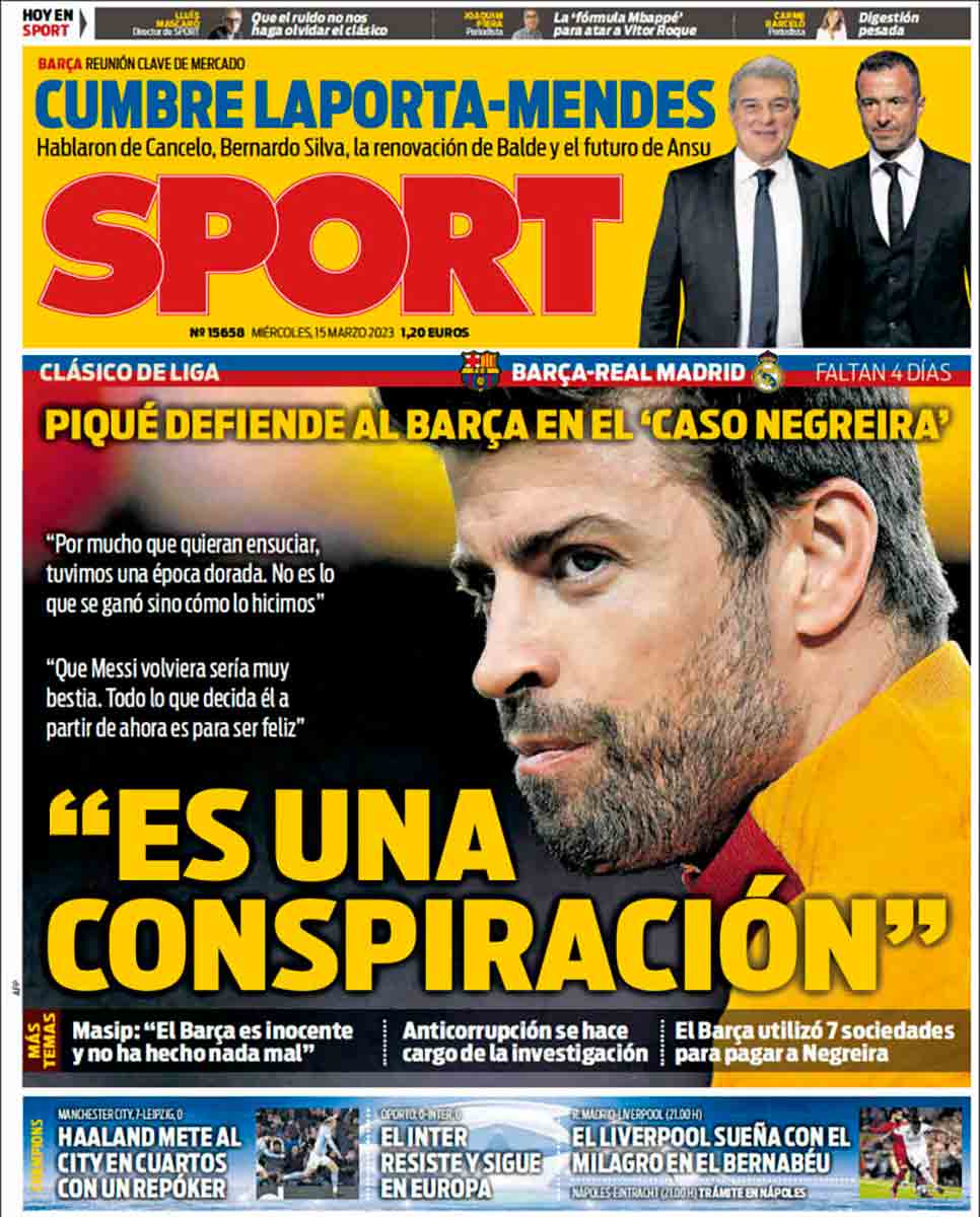 Sport refleja justamente la entrevista a Piqué, que es para reír de aquí al Jueves Santo, aproximadamente. “Es una conspiración”. No entendemos por qué no aparece alguna artista que cante sobre las cuestiones de Piqué que nada tienen que ver con la bragueta. Un reggaetón sobre Piqué y Geri, al estilo Shakira, puede causar sensación.