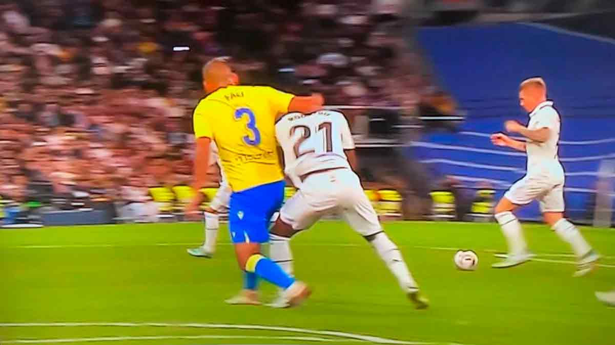 Para culminar las 5 jornadas post-Clásico, el jueves 10 de noviembre asistimos a una nueva edición de “cómo atacar a Vinicius y que no pase nada en el intento” y antes del primer minuto un tal Alejo se encarga de abrir la veda. Luego vendrían media docena añadida de faltas impunes y sin consecuencias para dicho lateral derecho. La culminación del acoso y derribo al madridista la protagonizó el jefe de la banda gaditana, su propio capitán, de nombre Fali (curiosos y antiestéticos estos nombres de jugadores violentos: Papu, Fali, Trejo, Balliu, Alejo, Isi), al que, minutos después de haber terminado el encuentro, pudimos ver en todo su “esplendor” agrediendo a Rodrygo en una imagen de DAZN que no se pudo ver mientras se jugaba (y lo que es peor, aparentemente nunca llegó dicha imagen a la sala VOR, lo cual es un escándalo mayúsculo y sin precedentes). Mientras veíamos con estupor tamaña fechoría, el susodicho Fali negaba la agresión (hablaba de “le he dado un poquito bastante”, el muy caradura) y aprovechaba para malmeter a Vinicius y a sus supuestas provocaciones.
