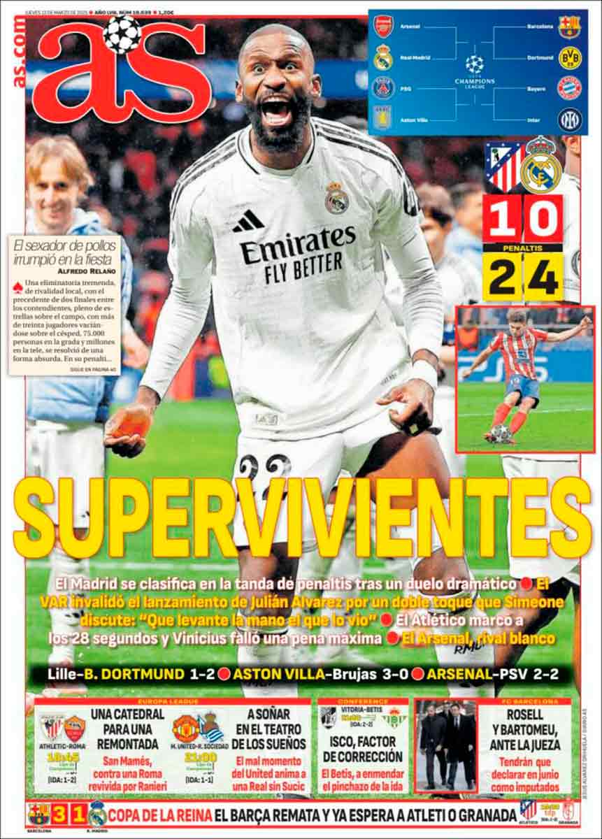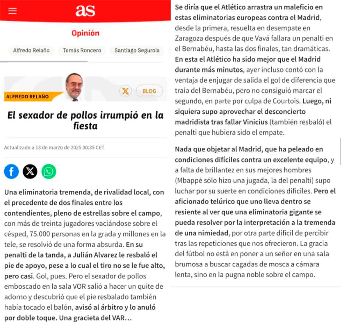 Nuestro querido Relaño hoy escribe una columna diciendo que el VAR no vino para estas minucias. Resulta que el linier que se pone al fondo en la tanda, fue el que vio algo raro en el golpeo, como hasta el propio Mateu en la retransmisión, y por eso el VAR revisa. Relaño pretende que existiendo VAR eso no se revise, solo porque AS no puede hacer merchandising del Madrid. Que ser más odioso y putrefacto.