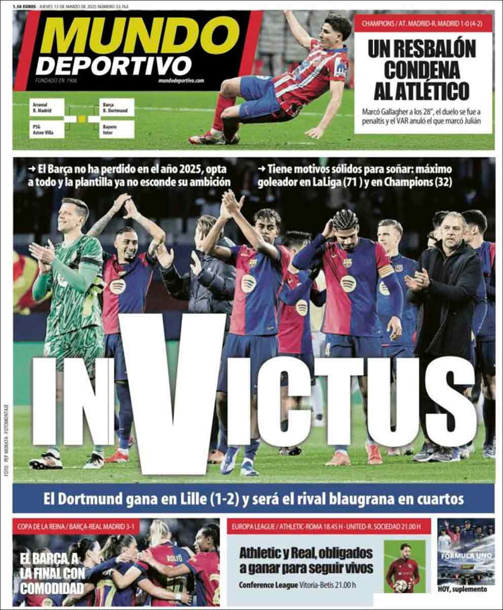 Mundo Deportivo tampoco compra la llorera atlética y de sus medios afines. Hablando de medios afines, nos hemos sorprendido de que Marca no abriese con un primer plano de Gil Marín y una ristra de quejas plañideras. Seguro que en la próxima barbacoa acuerdan cualquier otra cosa.