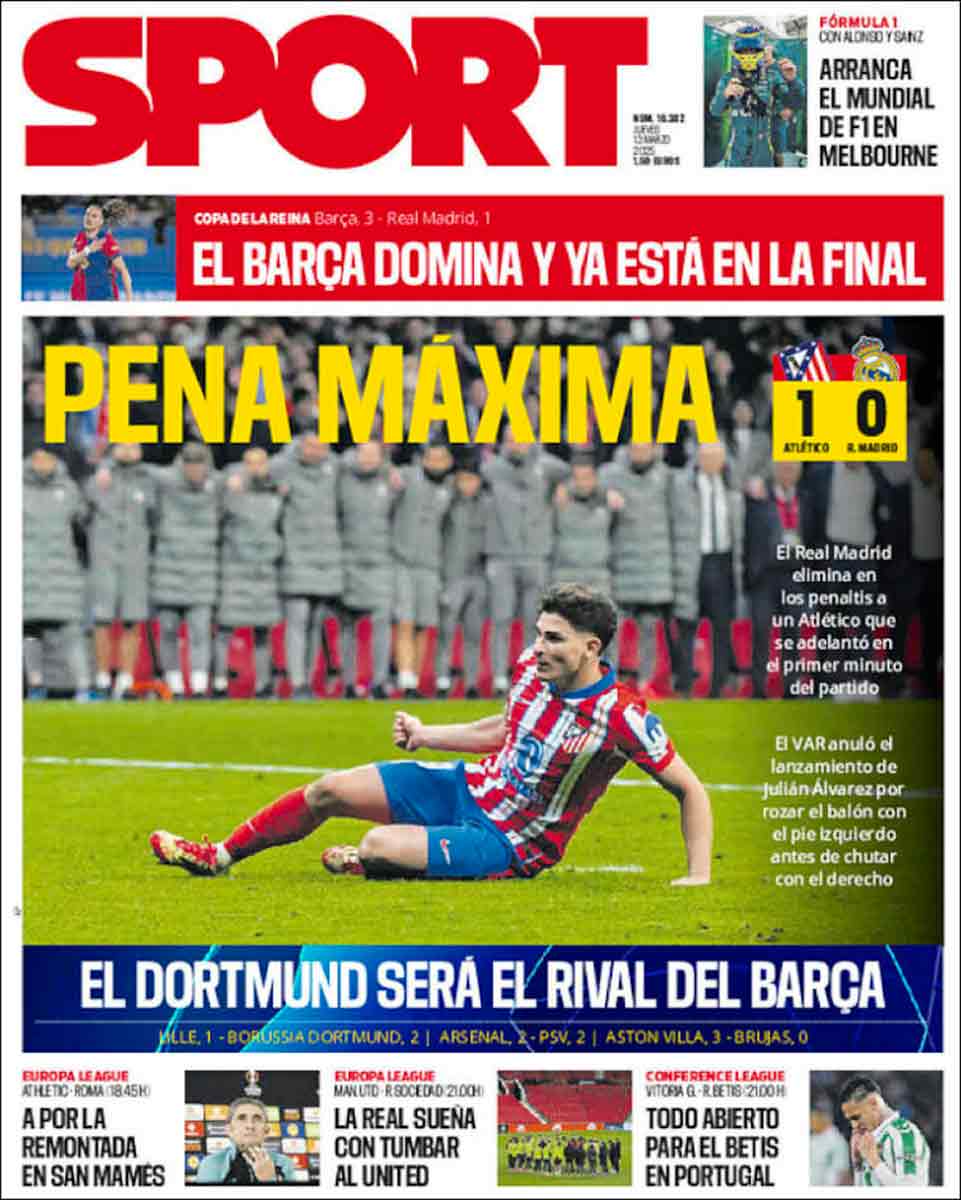 El doble toque fue evidente y en el campo el primero que lo sintió fue el propio Julián, que no sabía dónde meterse antes incluso de que lo anulase el VAR. Courtois también avisó, y el propio Mbappé, que se encontraba a cincuenta metros, corrió a notificárselo al cuarto árbitro. Cómo sería de claro que hasta Sport lo confirma en su portada: «El VAR anuló el lanzamiento de Julián Álvarez por rozar el balón con el pie izquierdo antes de chutar con el derecho».