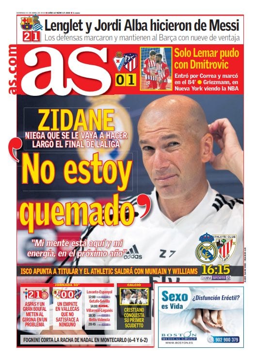 La prensa madrileña nos demuestra este domingo que hay varias maneras de resumir una rueda de prensa. 'La Ouija Today' se queda con que Zidane no está quemado. No sabemos si se sienten sorprendidos o si les fastidia que el entrenador del Real Madrid no esté tirando los muebles por casa y saliendo al jardín a gritar porque no puede más. En 'Marca' destacan que el tricampeón de Europa medita cambiar el dibujo la próxima temporada. Lo tenían como un técnico con flor y poco más y resulta que hay mucho que rascar dentro de Zizou.
