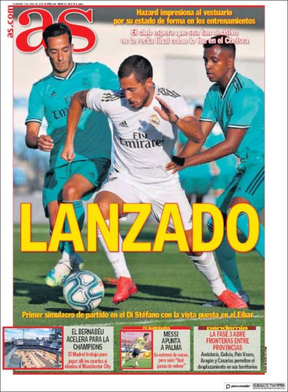 El asunto de portada es el mismo, un Hazard “lanzado” en pleno entrenamiento, del que nos cuentan que “impresiona al vestuario por su estado de forma”. Ya queda menos para verlo y comprobarlo sobre el terreno de juego, aunque no será el césped del Santiago Bernabéu, que aparece en la parte inferior con un titular extraño: “El Bernabéu acelera para la Champions. El Madrid trabaja para jugar allí los cuartos si elimina al Manchester City”. ¿De verdad creen que Florentino o José Ángel Sánchez han cambiado el plan de obra en estos últimos días por ese motivo?