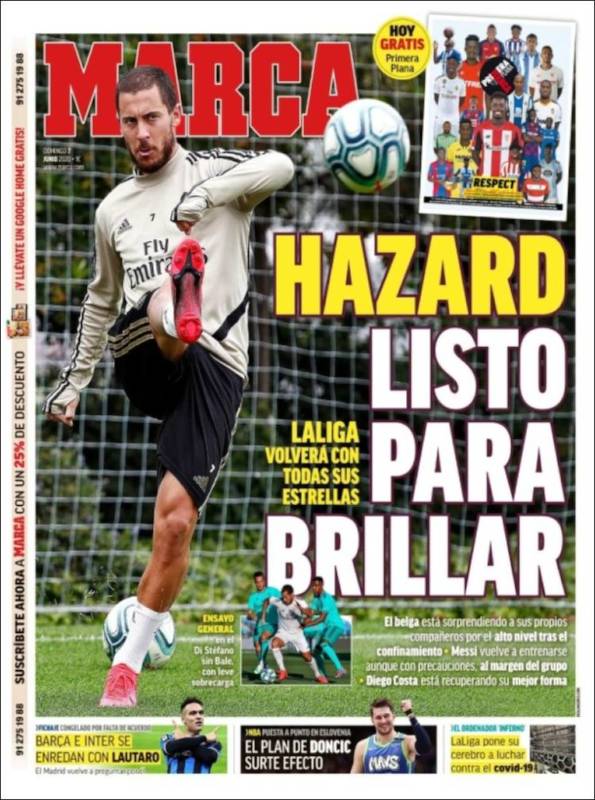Un entrenamiento, esa es la gran noticia del día: Hazard, listo para brillar. Es de agradecer una portada en la que Marca parece alabar el buen estado de forma de uno de los nuestros, el belga Eden Hazard, el mismo jugador sobre el que además se han vertido tradicionalmente comentarios acerca de su, llamémoslo eufemísticamente, grosor corporal. Demasiados comentarios acerca de su afición a ganar peso, y quizás por ello este titular nos retrotrae a aquel anuncio de cierta marca de natillas, ¿lo recuerdan? Acompañado de una música insoportable como solo pueden serlo las músicas pegadizas de anuncios: “Natillas Danone, listas para gustar”. Un soniquete que repetido mil veces al día se le pegaba a uno en el cerebro como el Every breath you take de Police pasado por el túrmix de cierta tónica. O como el cansino “me gusta el fúrbo, los domingos por la tarde es la mayor (pom, pom, pom) de mi-aficiones”. Oh, qué mítica sintonía para anunciar a los más cansinos de las retransmisiones deportivas.