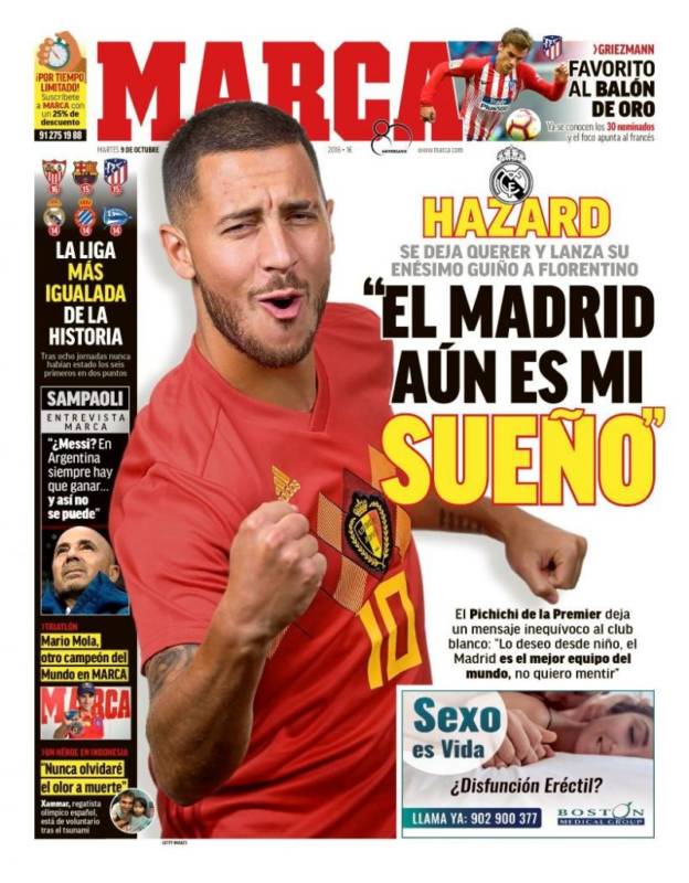 Justo lo que he pensado al ver la portada del As. Y muy bueno, el sarcasmo sobre que Hazard quiere venir "a La Liga". Ya cuando el Madrid estaba negociando el fichaje de Courtois, creo recordar que Hazard dijo algo como: "Adonde vaya Thibaut, iré yo".