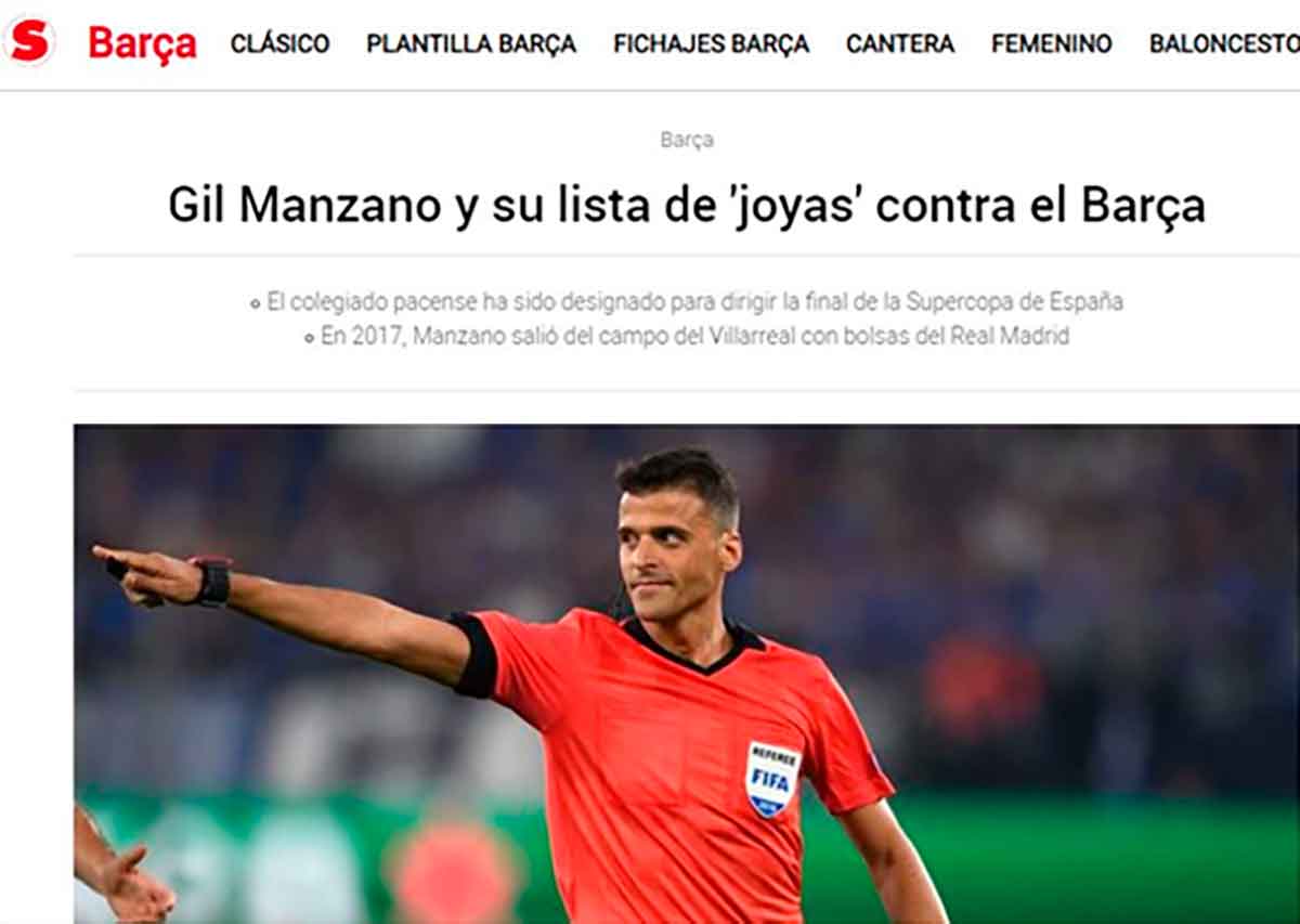 No podemos dejar pasar por alto uno de los titulares que acompañan la información acerca de la Supercopa: “Gil Manzano, el árbitro de las polémicas con el Barça, designado para el partido”. Jojojojo, que diría el primo de De Burgos. Este portanalista de guardia ha querido saber a qué se refieren en Sport con esa preocupación y ha encontrado un documento del más puro periodismo de investigación, nivel Iván San Antonio por lo menos: