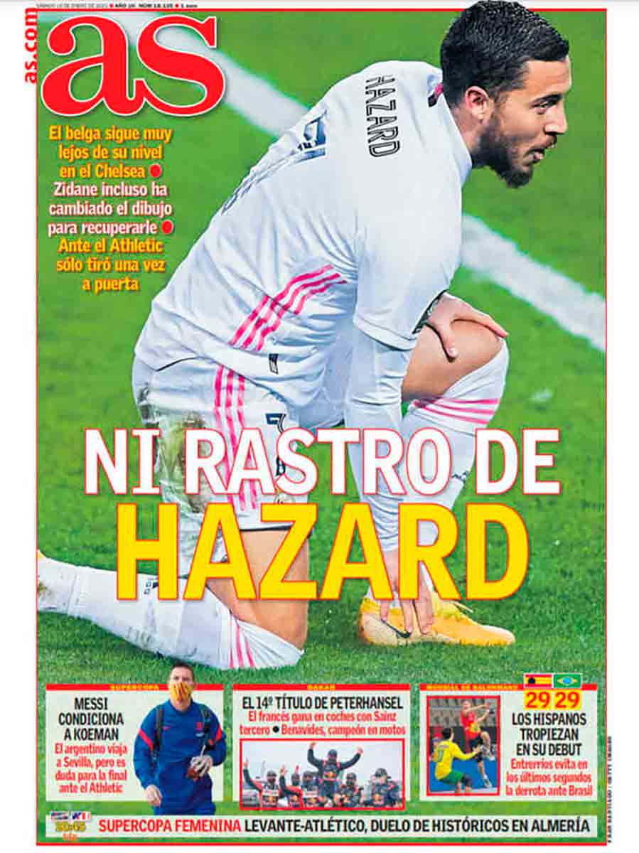 No podemos rebatir que las prestaciones del belga tras temporada y media están muy por debajo de las esperadas, a kilómetros de distancia del futbolista que fuera elegido mejor jugador de la Premier dos años seguidos, el Balón de Plata de aquel Mundial de Rusia en el que nos enamoramos de su juego. Ni rastro de ese Hazard, como señala la portada de As, que también nos cuenta que Zidane “confía en recuperarle” (leísmo que no nos sorprende en quienes asesinaron la coma del vocativo hace años). La foto escogida nos parece de lo más apropiada: Hazard se toca el tobillo, la zona en la que los defensas rivales se aplican con mayor dureza sabedores de la debilidad del belga y de la impunidad con la que cuentan al castigar sus tobillos.