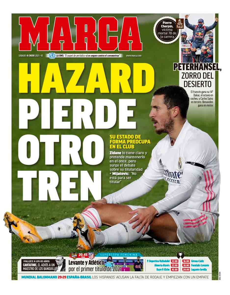 Hazard pierde otro tren”, nos dice Marca, a la par que nos muestra una foto del belga en el suelo. No sabemos qué tren es el que perdió, máxime en esta época de pandemias en la que tomar el tren se ha convertido en un ejercicio de riesgo, o si tratan de hacernos un sutil juego de palabras acerca de “en-tren-ar”, pero lo que sí es seguro es que Hazard se encuentra en el suelo tras la tarascada de uno de esos rivales que lo pasan por encima cual tren de mercancías.