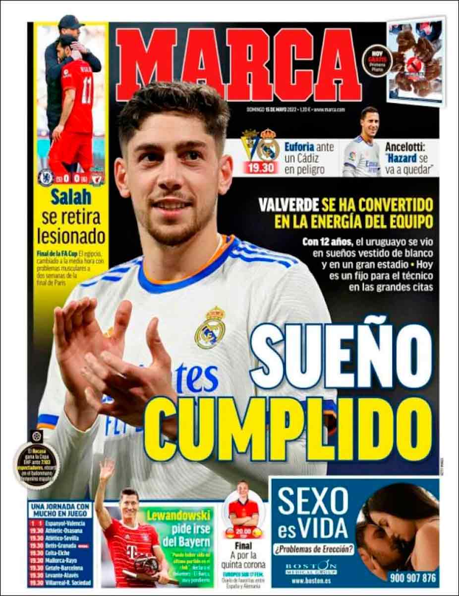 La historia del protagonista de la portada de Marca es opuesta a la Hazard, Federico Valverde entró con buen pie en el Madrid y a pesar de las idas y venidas del once propias de su juventud, se le está poniendo una cara de viga maestra del Madrid de los próximos diez años que no puede con ella. Es un futbolista bárbaro.