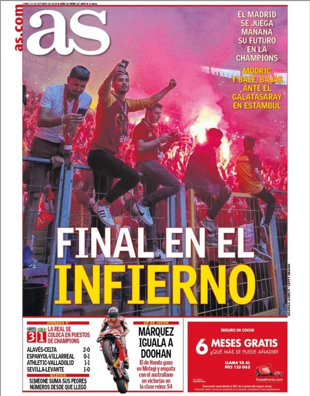 El ambiente, además, no será sencillo. Nunca lo es en Turquía. Lo señala correctamente la portada de As, que a su vez apostilla algo no menos innegable y doloroso: ni Modric ni Bale serán de la partida.
