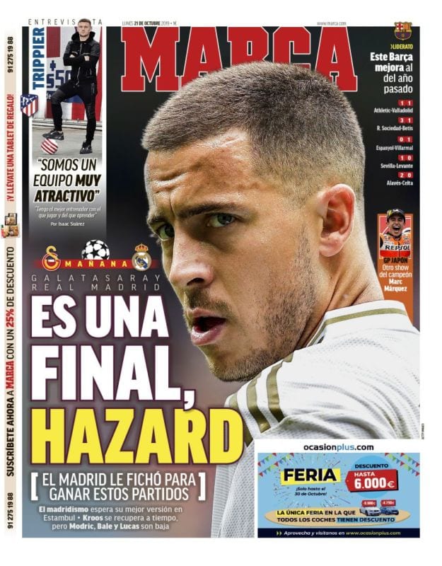 Marca, por su parte, centra en Hazard la mayoría de la responsabilidad en lo que haya de suceder mañana, y tenemos que decir (con gran dolor, porque lo que nos gustaría es criticar la habitual tendencia de la prensa a demonizar a jugadores concretos, mientras descarga de tensión a otros) que en esta ocasión el foco no nos parece mal colocado.