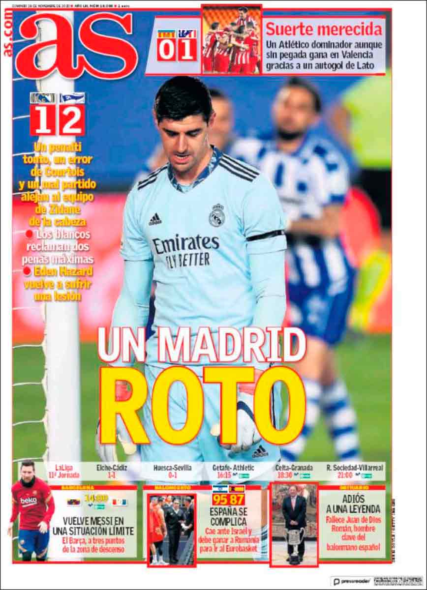 "Un Madrid roto", titula As, y nosotros no podemos objetar nada a ese titular, aunque sí quisiéramos añadir alguna otra razón a las que, según As, motivaron esta nueva derrota liguera. Porque sí, coincidimos en que cometimos un penalti tonto, y sí, coincidimos en que Courtois cometió un error grave, y sí, coincidimos, digámoslo las veces que haga falta, en que el Madrid hizo un mal partido. Pero coincidiríamos ya plenamente con As si los dos penaltis que no le concedieron ayer al Madrid no quedaran reflejados en su portada como una mera reclamación blanca, sino como una constatación de que esos penaltis tuvieron lugar y no fueron pitados. Tal factor no excluye las ya señaladas razones de la derrota, pero sí las amplía hasta hacerlas más ajustadas a lo que de hecho pasó ayer contra el Alavés.