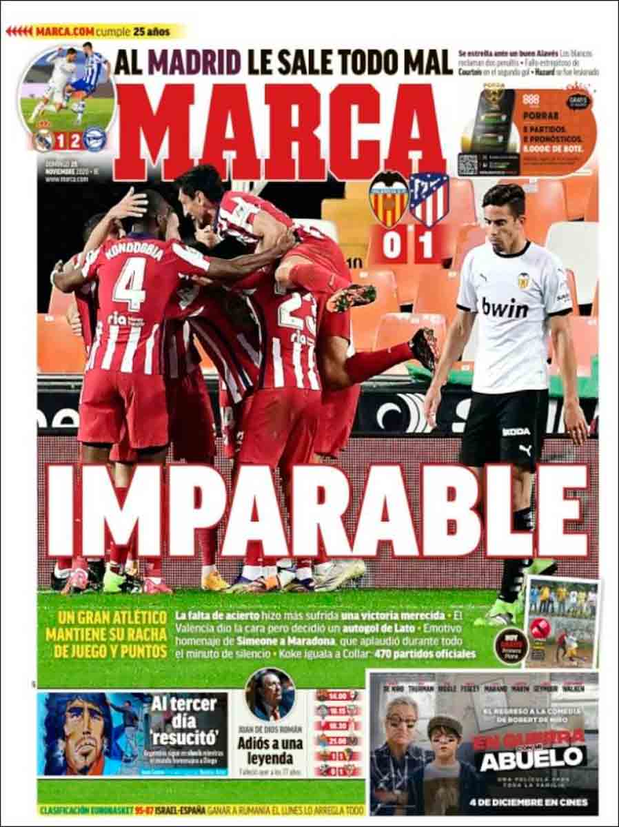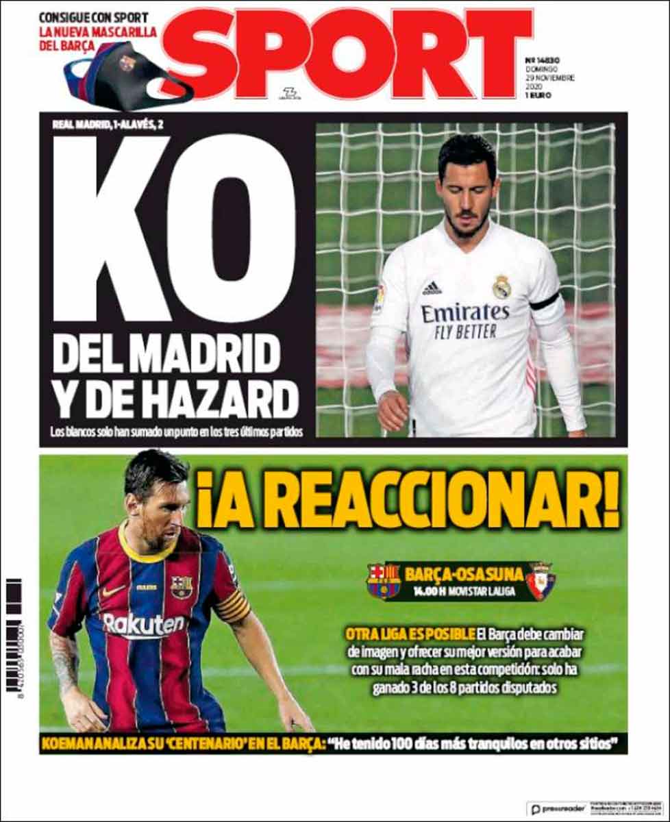 Dice Sport que "otra Liga es posible", así, en plan mayo del 68, pero lo que no parece posible es otro periodismo, o al menos un periodismo que pueda llegar a merecer ese nombre, porque justo encima de esa llamada al sueño y al cambio de época, el KO que le dedican al Madrid y, sobre todo, el KO que le dedican a Hazard por haber salido lesionado ayer del campo no parece una manera de invocar posibles mundos mejores, sino más bien una nueva manera de demostrar bajeza ante la, mucho nos tememos, sonrisilla perversa con la que han perpetrado esta confección de portada. No queremos pensar que tal confección esconde una celebración por la nueva lesión del jugador belga, no queremos.