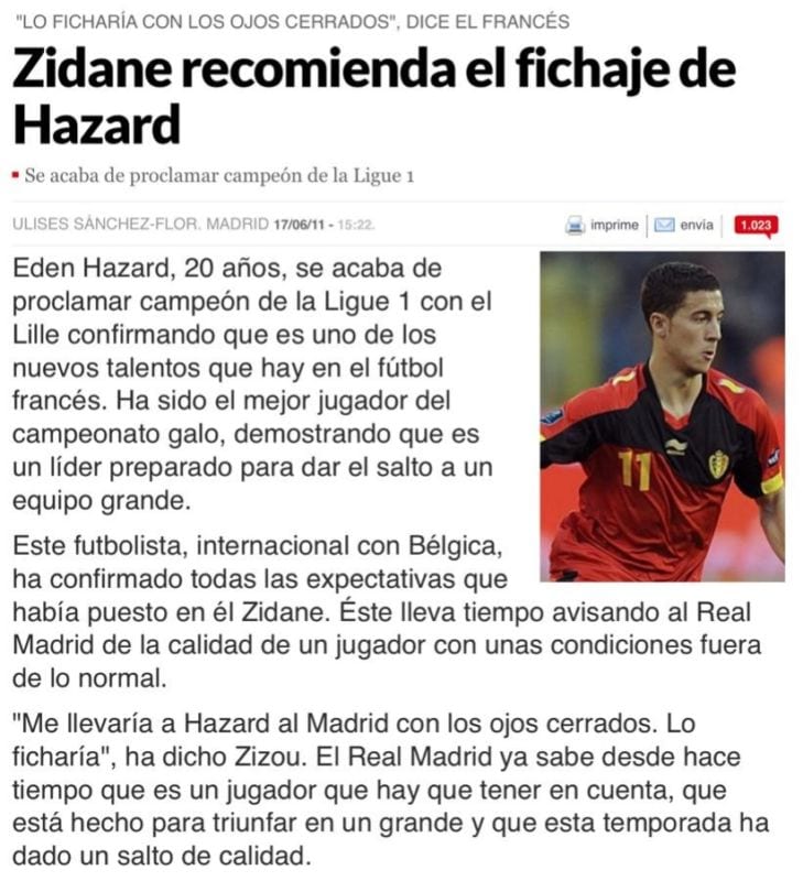 Buenas tardes, sea el media punto Hazard bienvenido, su llegada es una subida de nivel en la calidad del equipo titular, que roza lo obsceno, sólo cambien al bueno de Lucas Vázquez por el belga, pero uno de los problemas, ( que no debería ser tal para un buen entrenador) es que el Madrid juega ultimamente ( y así nos va) un 4-3-3, no es difícil darse cuenta que Hazard en banda rendiría mucho menos que con libertad de movimientos, si además mantenemos a Karim de tutular, y en la izquierda Vinicius, es fácil de darse cuenta de que el equipo empezara a crear ocasiones como churros y nos lo pasaremos "pipa", pero son 3 jugadores, de los cuales ninguno te aporta nada en defensa, son el 0 a la izquierda, la conclusión es clara o Zidane cambia su 4-3-3, o el año que viene la Copa de Europa la final la veremos por televisión, vean sino el trabajo en defensa que hicieron esta temporada las tripletas atacantes de Ajax y Liverpool, es lo que hay