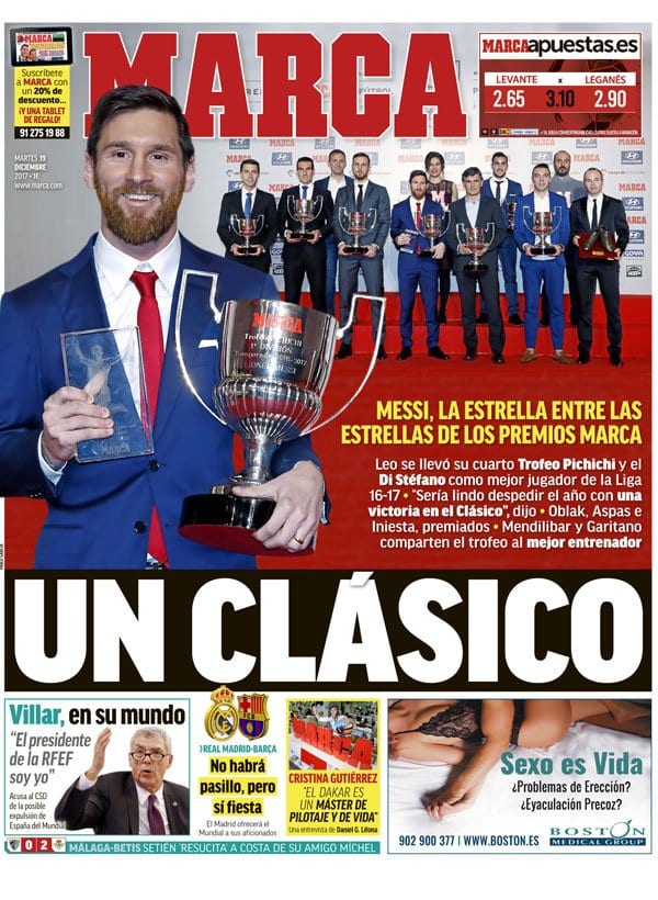 Por último, en 'Marca', el diario de todas las aficiones, saca una primera página dedicada a casi todos menos al mejor equipo del mundo en 2017. Luego vendrán las lamentaciones si la gente deja de leer dicho periódico. No imaginamos a los culés mostrando en portada a Cristiano Ronaldo y felicitado a Luka Modric y Marcelino García Toral, la verdad. El bienquedismo es algo que acaba cansando en España. Tiene fecha de caducidad. Y, lo que es peor, te lleva a tratar injustamente al equipo que lo ha ganado casi todo y que es, curiosamente, el que ha hecho grande tu publicación. Allá cada uno con su manera de gestionar el día a día. Todo llega.