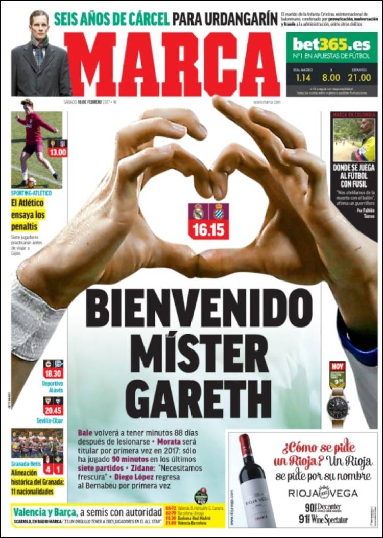 No es porque sea sábado sabadete, pero la ocasión pide camisa nueva, perfecto estado de revista e ilusión en la mirada. Dirán que siempre que juega el Madrid es momento propicio para esas tres cosas, y dirán muy bien. Pero es que hoy, queridos galernautas, vuelve Gareth Bale al césped del Bernabéu y las mocitas madrileñas vienen cantando desde Cibeles, ya casi en Colón, Castellana arriba. Se las oye vivarachas y no es para menos. Love is in the air everywhere I look around, como ejemplifica la portada de Marca from the bottom of the heart.