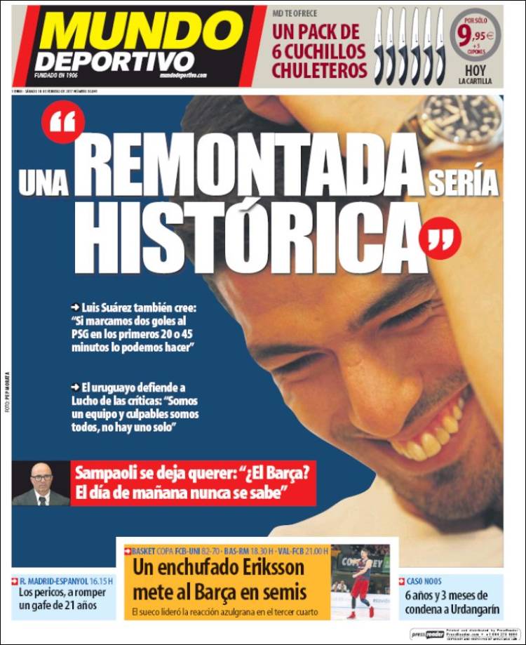 Desde la portada de la Superpop que hoy homenajea Mundo Deportivo, Luis Suárez quiere cambiar -qué ternura- los tiempos, los ritmos, las tendencias y hasta las dinámicas de la Historia. Hasta Guardiola se suma al desbordado intento diciendo Barça en una frase que se acuñó para el Real Madrid. Por supuesto no atisbamos rastro alguno de estilo, tiki-taka, posesión o césped en estos intentos, cosa que nos lleva a pensar (miren si seremos raros) que todo eso no importa nada -que todo eso es también maleza- cuando llega la hora de lo que importa, de lo único que realmente importa (también a ellos, oh sorpresa).
