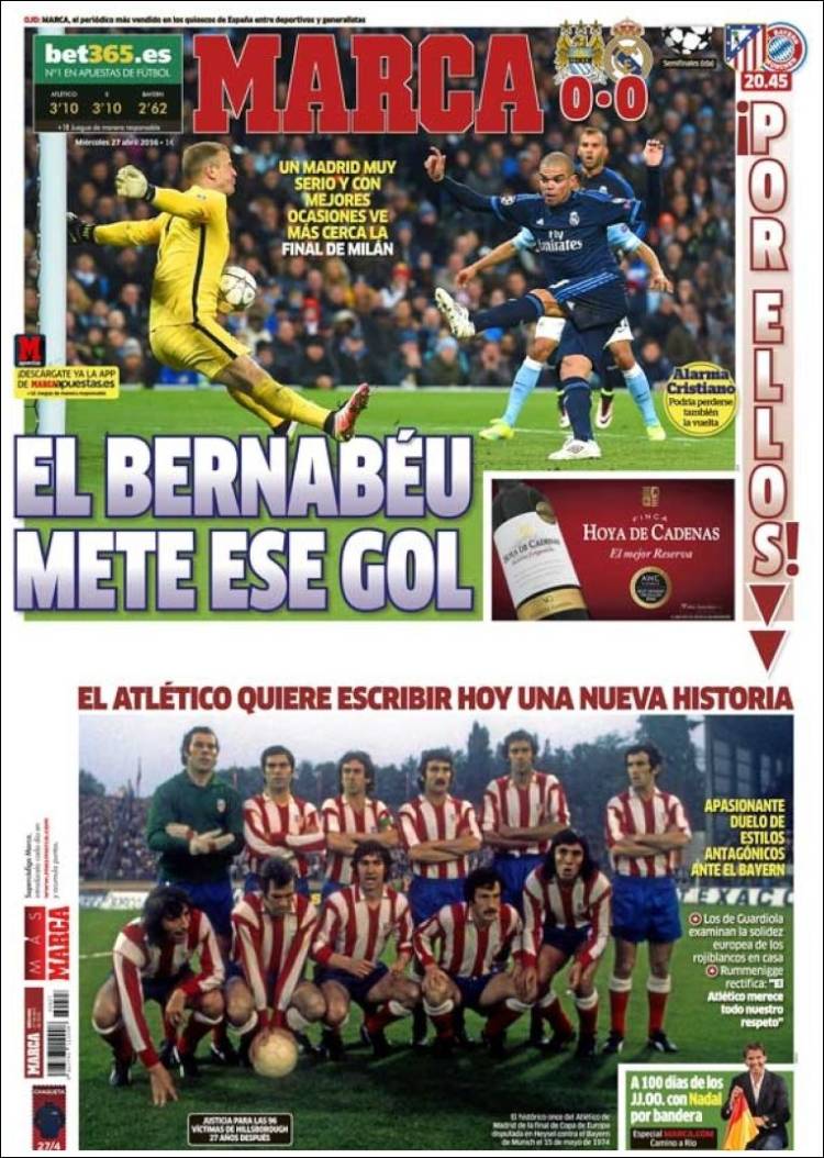 Nos dice Marca que ese gol (el de Pepe, que también llega a esta primera plana) lo marcará el Bernabéu, ejercicio de prospección al futuro que contrasta con la parte de abajo de la portada.