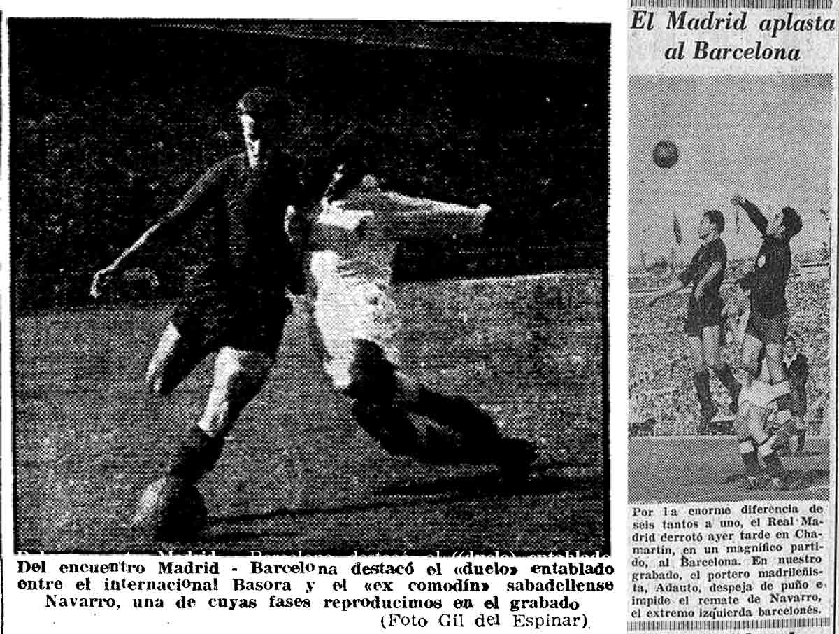 El segundo tuvo de protagonistas a los hermanos Navarro Perona. La curiosidad es que ambos llegaron a compartir vestuario en el Real Madrid unos meses después de enfrentarse en choque liguero. Joaquín, conocido como ‘Fifo’ fue un lateral derecho muy veloz, pegajoso y eficaz en la marca, que subía bien la banda por su vocación ofensiva de antaño y que era polivalente al poder actuar también por la zona siniestra. Mientras que Alfonso, un jugador rápido, con buen manejo del balón y olfato de gol, se desempeñaba como extremo izquierdo, aunque realmente era un comodín que se amoldaba a otras zonas del frente ofensivo. Ambos se formaron en el Gavá y el Barça les echó el lazo para contratarles. Sin embargo, Joaquín solo estuvo un curso en el primer equipo, concretamente la temporada 1941-1942, y tras un rifirrafe con la directiva blaugrana -que no le pagó una prima copera- dejó la entidad y se marchó al Sabadell. Su gran rendimiento llamó la atención del Real Madrid que en el verano de 1949 se hizo con sus servicios. Alfonso, por su parte, permaneció en el Barça en una primera etapa hasta el verano del 50 cuando firmó por el Sabadell. En el cuadro arlequinado pasó seis meses (varios de ellos lesionado), y el Real Madrid le contrató a principios del año 1951. Desde enero hasta diciembre, los dos hermanos Navarro Perona vistieron la camiseta blanca y coincidieron en cuatro partidos de Liga y dos amistosos ante el Saarbrücken y Alavés. Para distinguirlos, Joaquín en las alineaciones aparecía como Navarro I y Alfonso como Navarro II. Los hermanos se separaron a comienzos de 1952, al irse Alfonso al Real Valladolid.