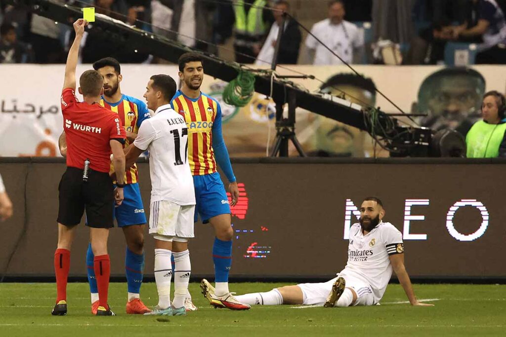 Como es habitual, vimos un arbitraje extraño e indescifrable del arrecifeño. Si el listón de las faltas era el que puso al señalar una de Kroos sobre Almeida en el 15', se entiende regular que no señalase un pisotón por detrás a Benzema y una obstrucción a Vinicius pocos minutos después.