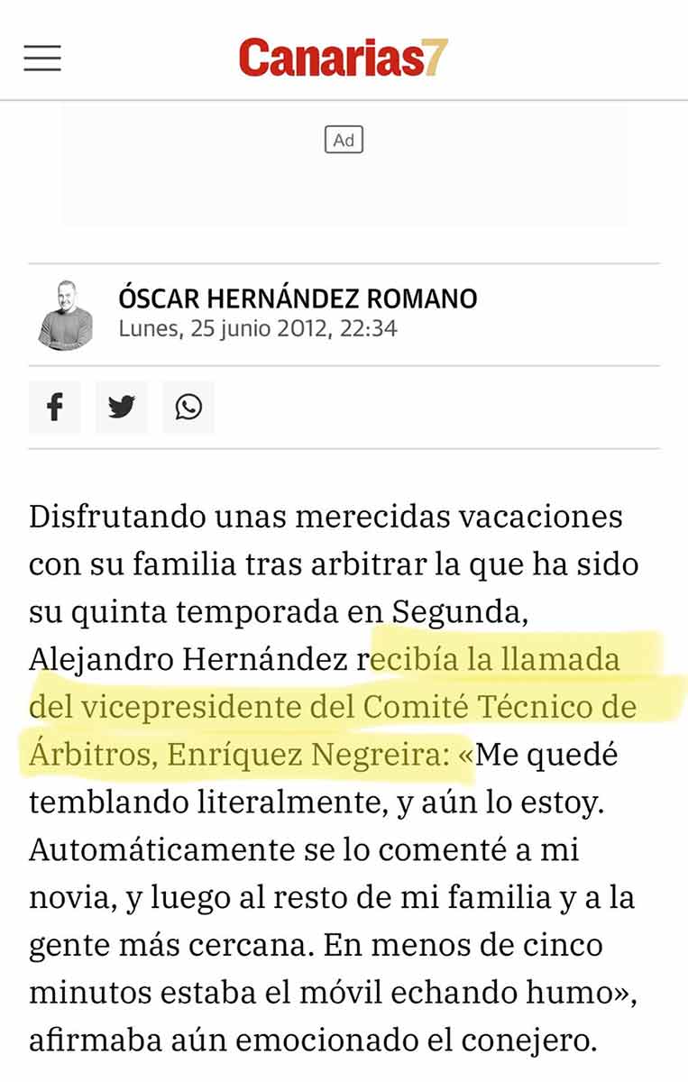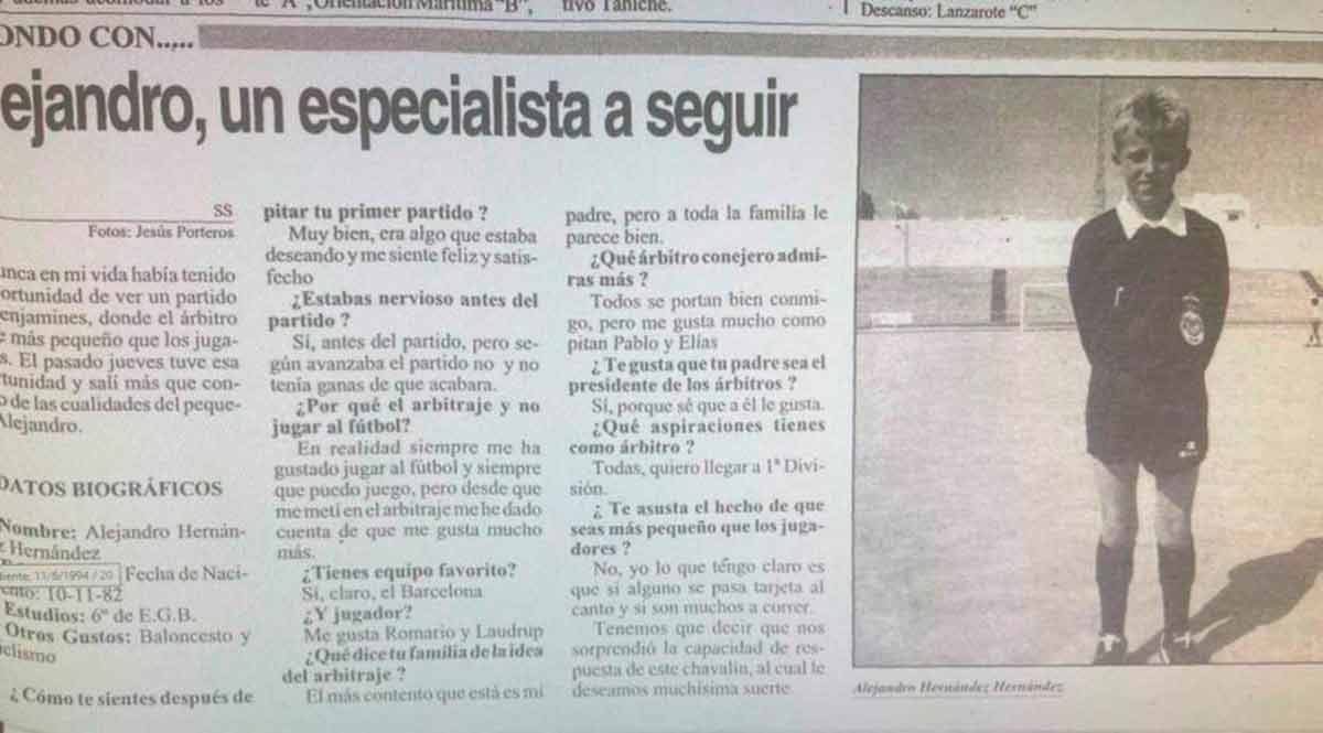 Alejandro José Hernández Hernández fue uno de los principales colegiados que predicó en el colectivo arbitral durante la época del Negreirato. Colegiado por el Comité Canario, Hernández Hernández nunca tuvo reparo en mostrar su barcelonismo desde muy joven para que nadie tuviera a bien dudar de la honestidad de su trabajo. Por este motivo y no por sus negreiros arbitrajes fue perseguido y martirizado por el madridismo de la época. Que el joven trencilla ascendiera velozmente en el comité canario que presidía su señor padre no es más que una muestra de las buenas capacidades que tanto se ha preciado de tratar de encontrar el CTA durante la época de Negreira.