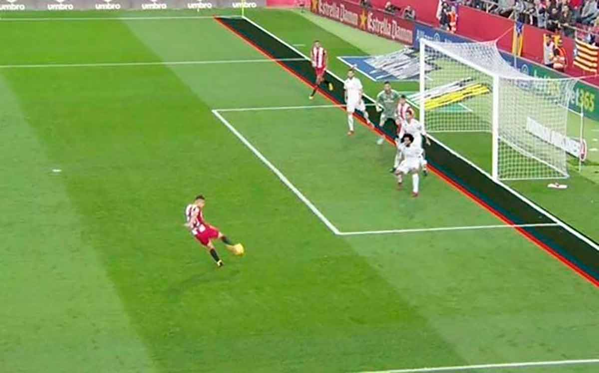 Un mes más tarde, el Girona gana 2-1 al Real Madrid en un partido en el que Hernández Hernández no vio penalti aquí (y por tanto no lo hubo) y concedió este gol en fuera de juego. Fuera de juego a ojos de mortal. El ojo de Hernández Hernández, en cambio, vislumbró con su infalibilidad habitual cómo debía de haber algún jugador blanco al fondo de la banda que lo habilitaba, aunque desgraciadamente las escrituras no parecen ponerse de acuerdo en esto último. De nuevo, es preciso realizar un acto de fe y confiar en la pericia del canario.