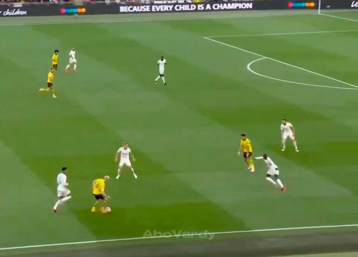 La primera de ellas es la capacidad de interceptación y anticipación de Mendy. Estas dos cualidades marcan mucho el nivel de inteligencia defensiva y conocimiento del juego de un futbolista y, sobre todo, su estado de concentración en el mismo. Durante la final se vieron varias acciones en las que el lateral demuestra ser un maestro del arte de la interceptación, esperando al momento justo en el que el atacante va a dar el pase o hacer el regate para atacar el balón. Destaco esta en particular porque, aparte de apreciarse perfectamente, Ferland no deja de estar pendiente de su marca mientras ejecuta esta acción defensiva.